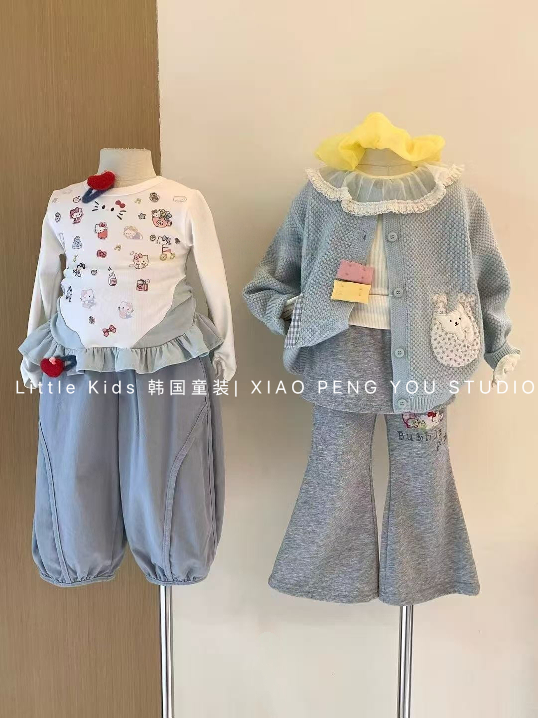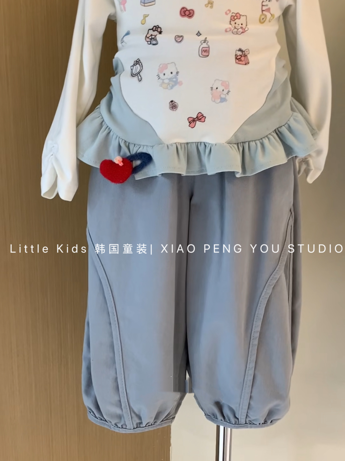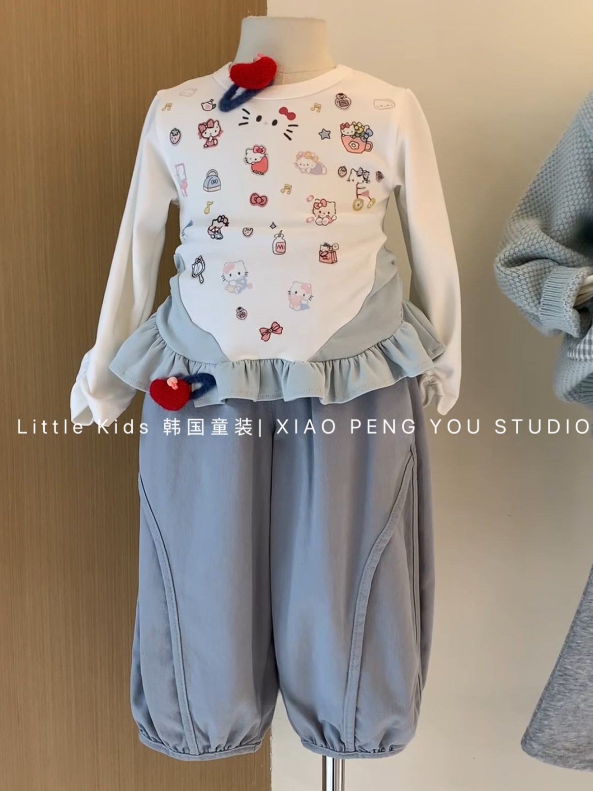 女童kt猫长袖t恤秋装2025女孩满印猫咪花边打底衫hello kitty上衣