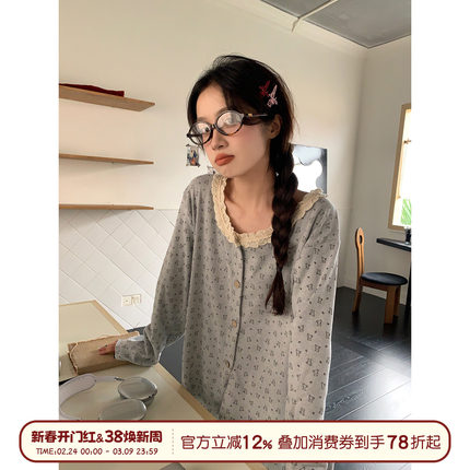 馨帮帮Homedress 甜美蕾丝圆领小熊睡衣女秋冬德绒磨毛家居服套装