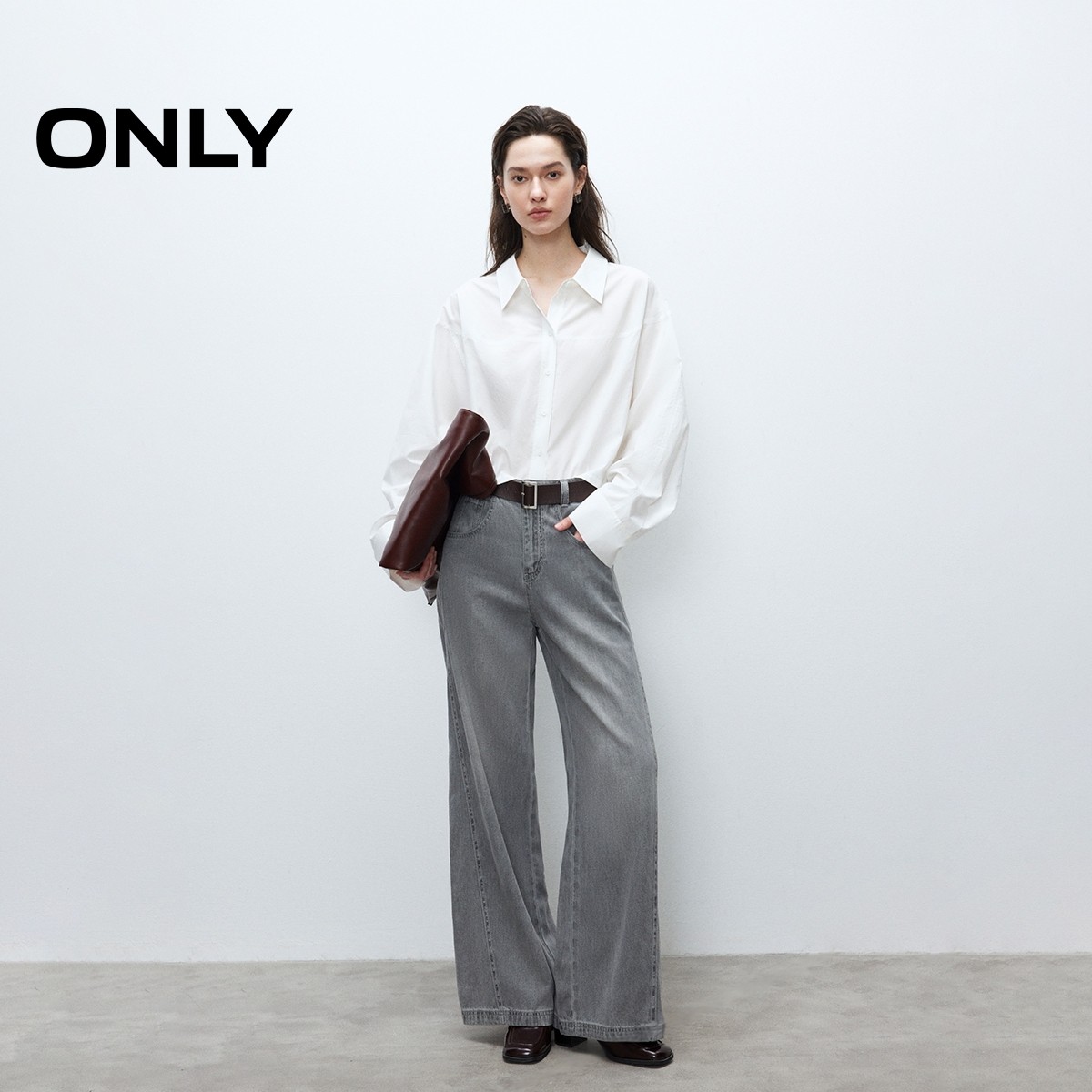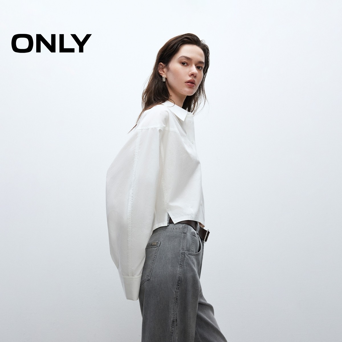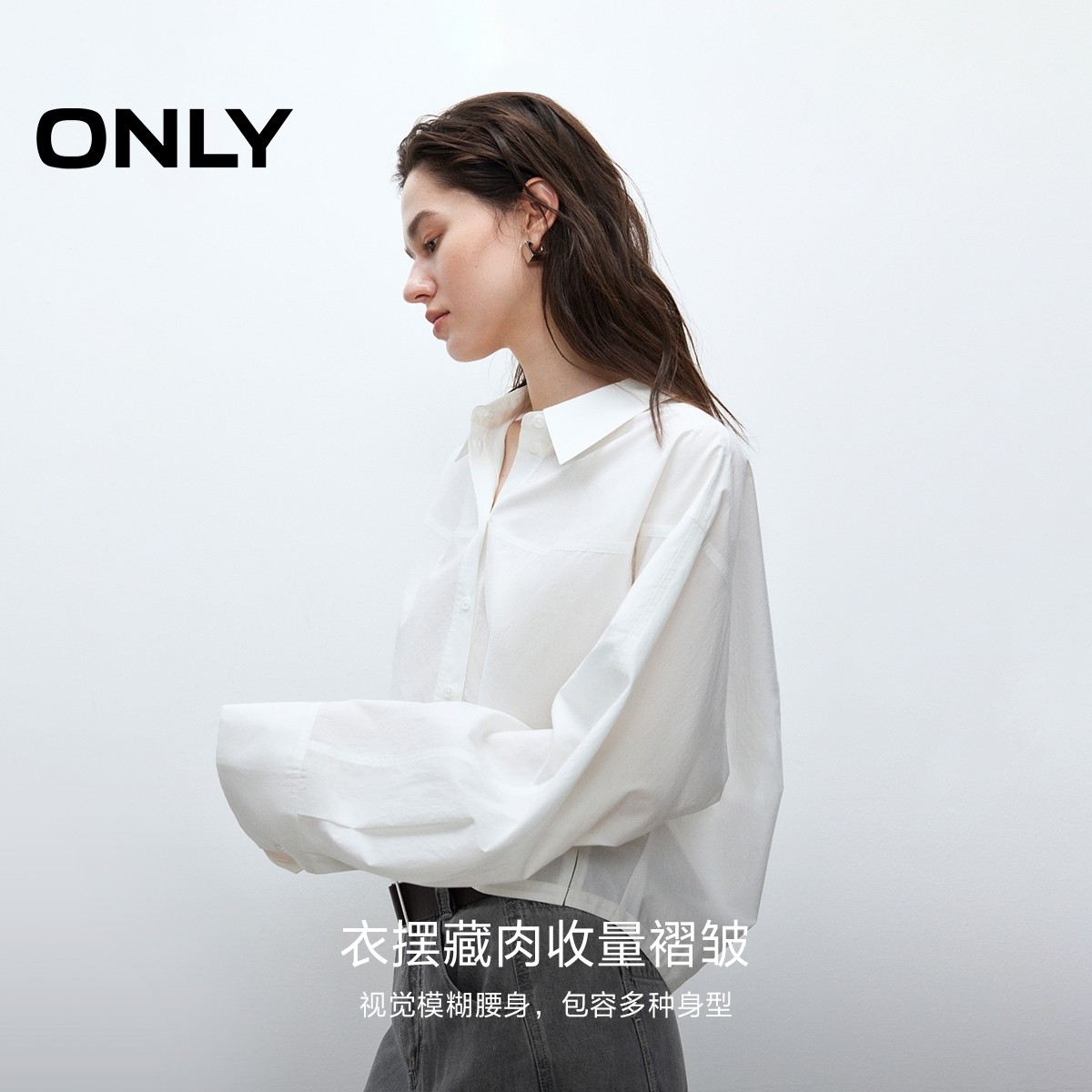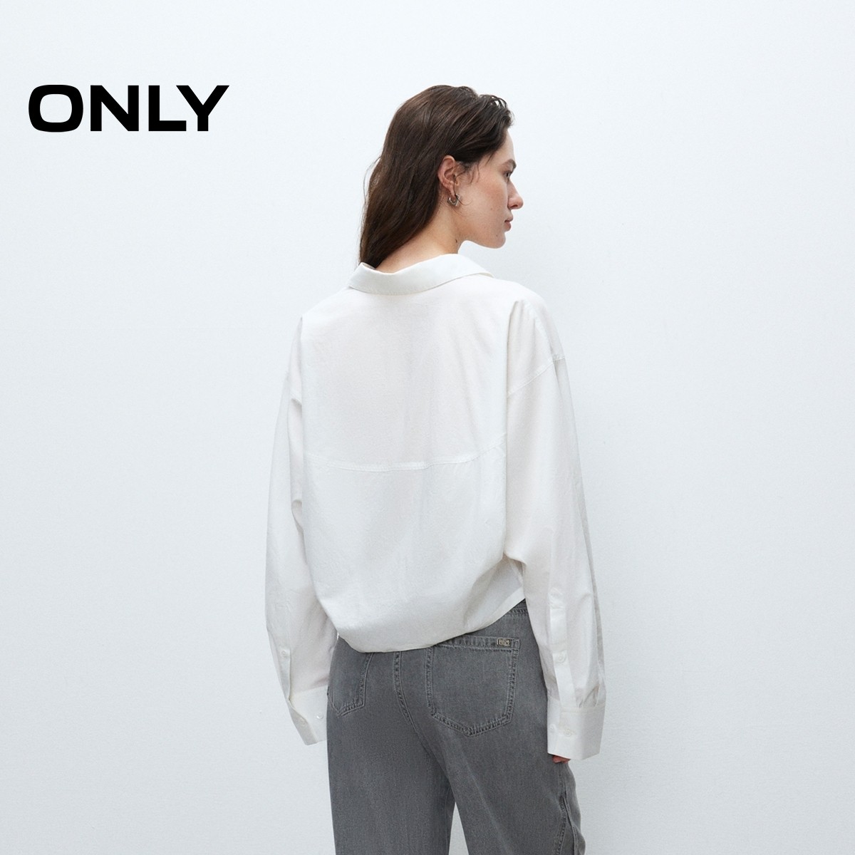 ONLY落肩长袖翻领短款白衬衫