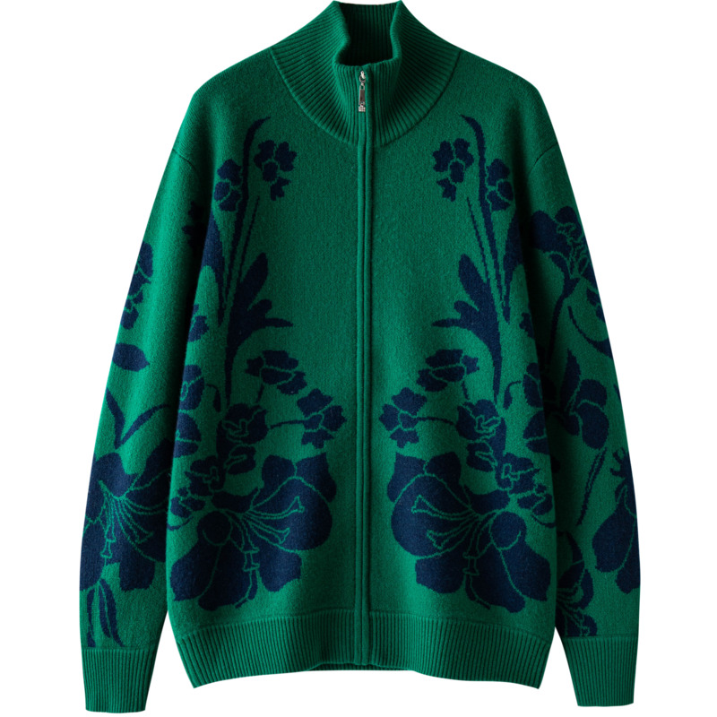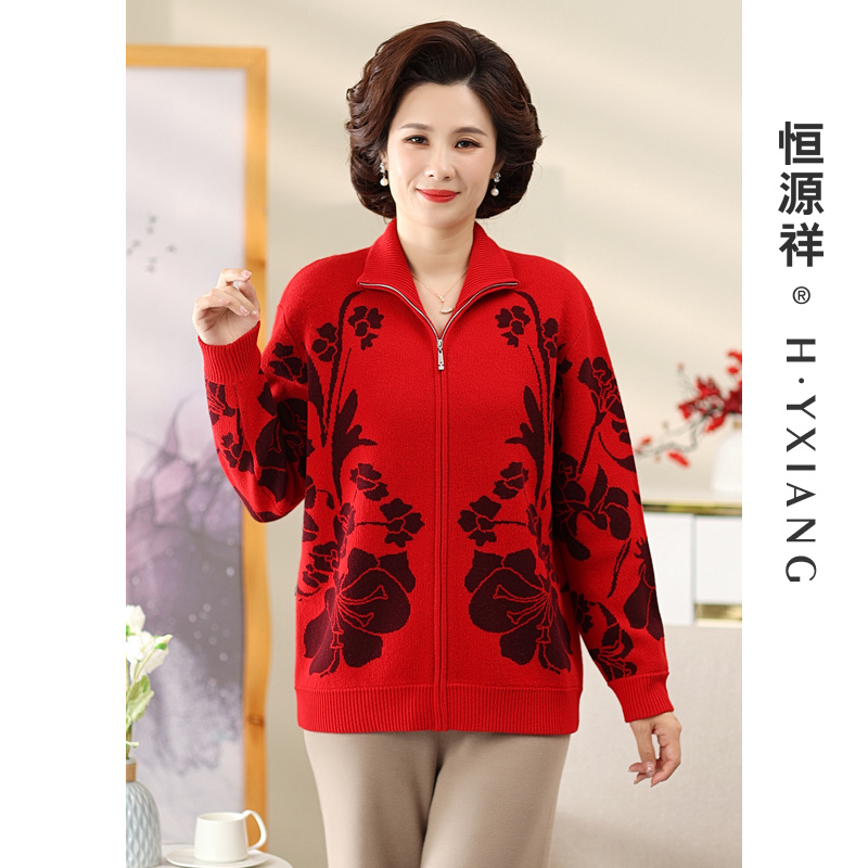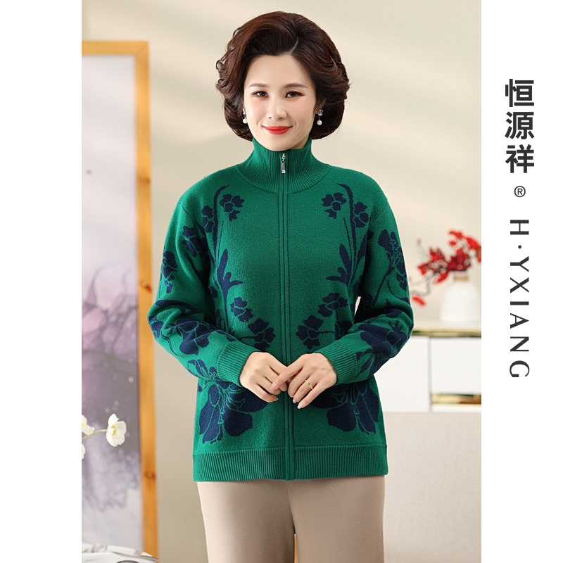 Q恒源祥妈妈装提花羊毛衫女开衫秋冬款休闲拉链中老年厚毛衣外套