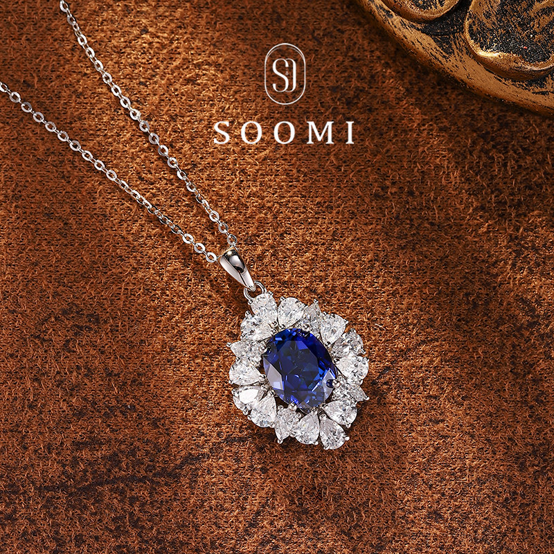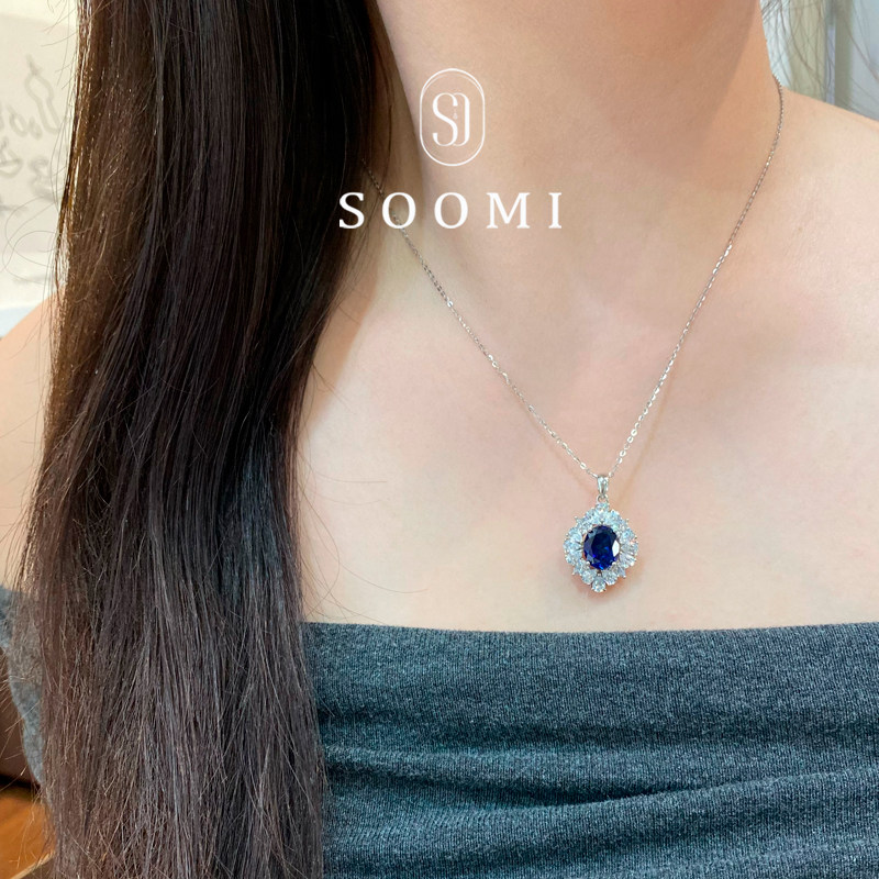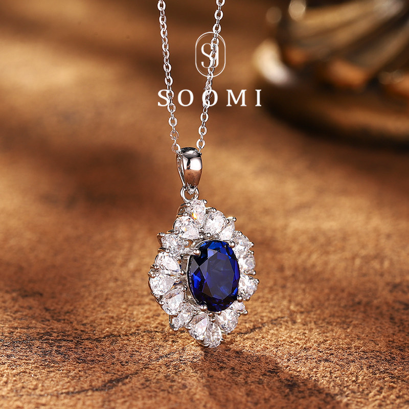 【SOOMI兰佩】925银实验室培育皇家蓝宝石项链豪华钻石经典吊坠女