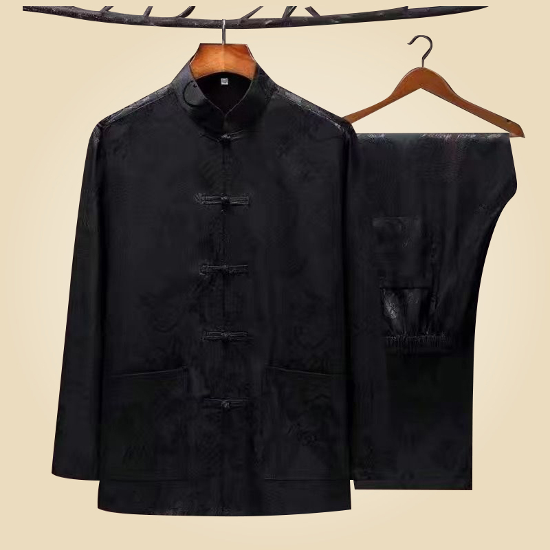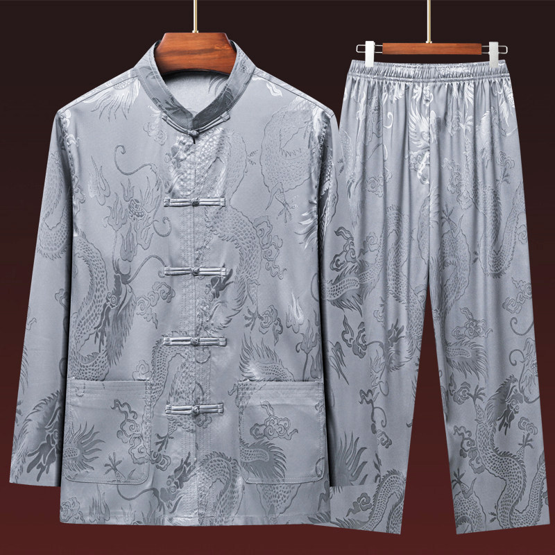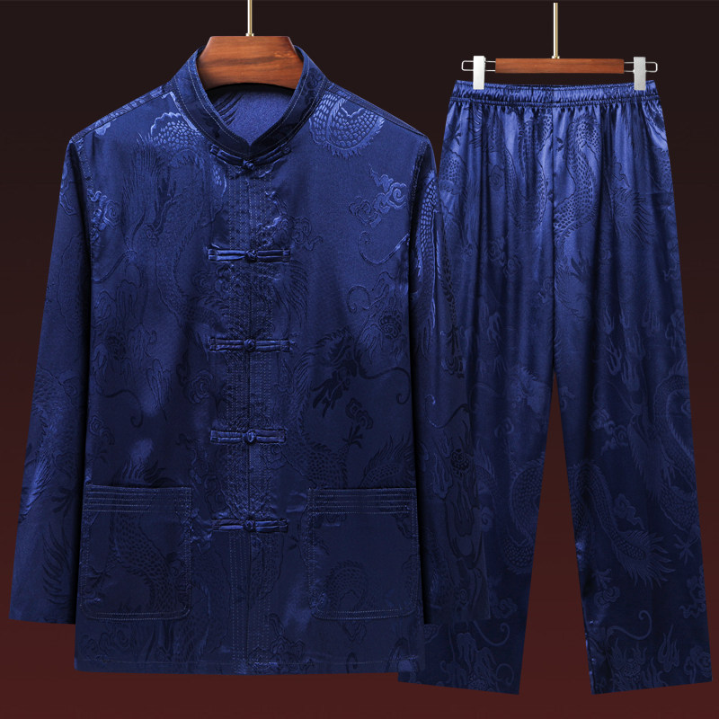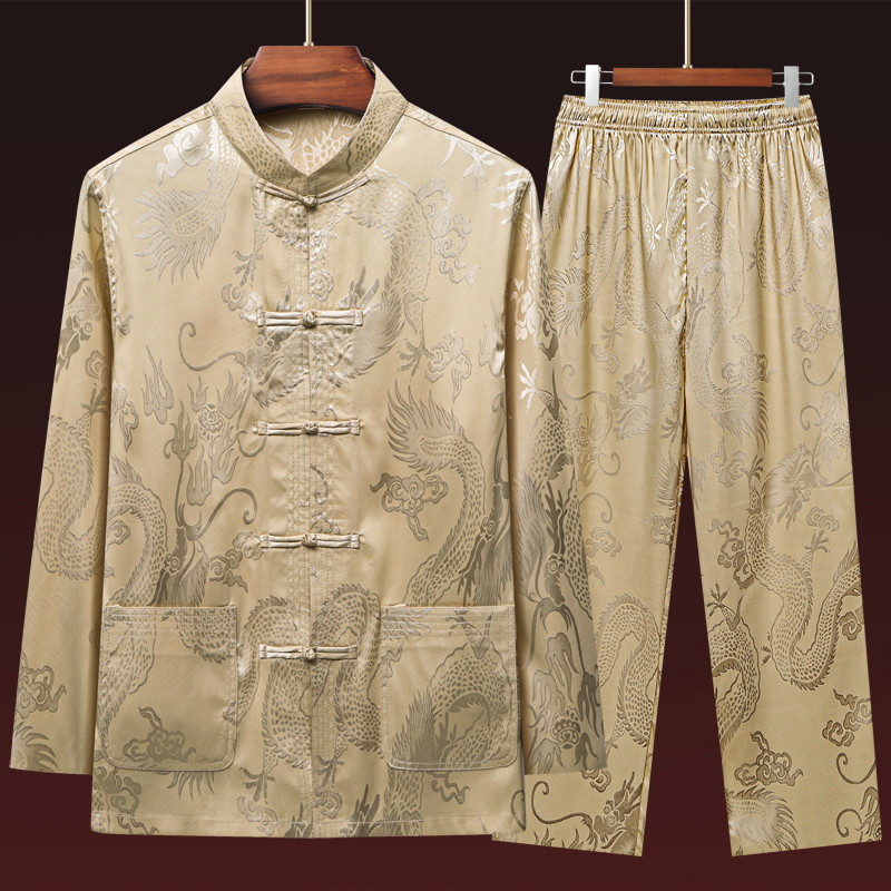唐装男冰丝长袖套装春夏中老年复古风汉服爸爸男装老人爷爷太极服