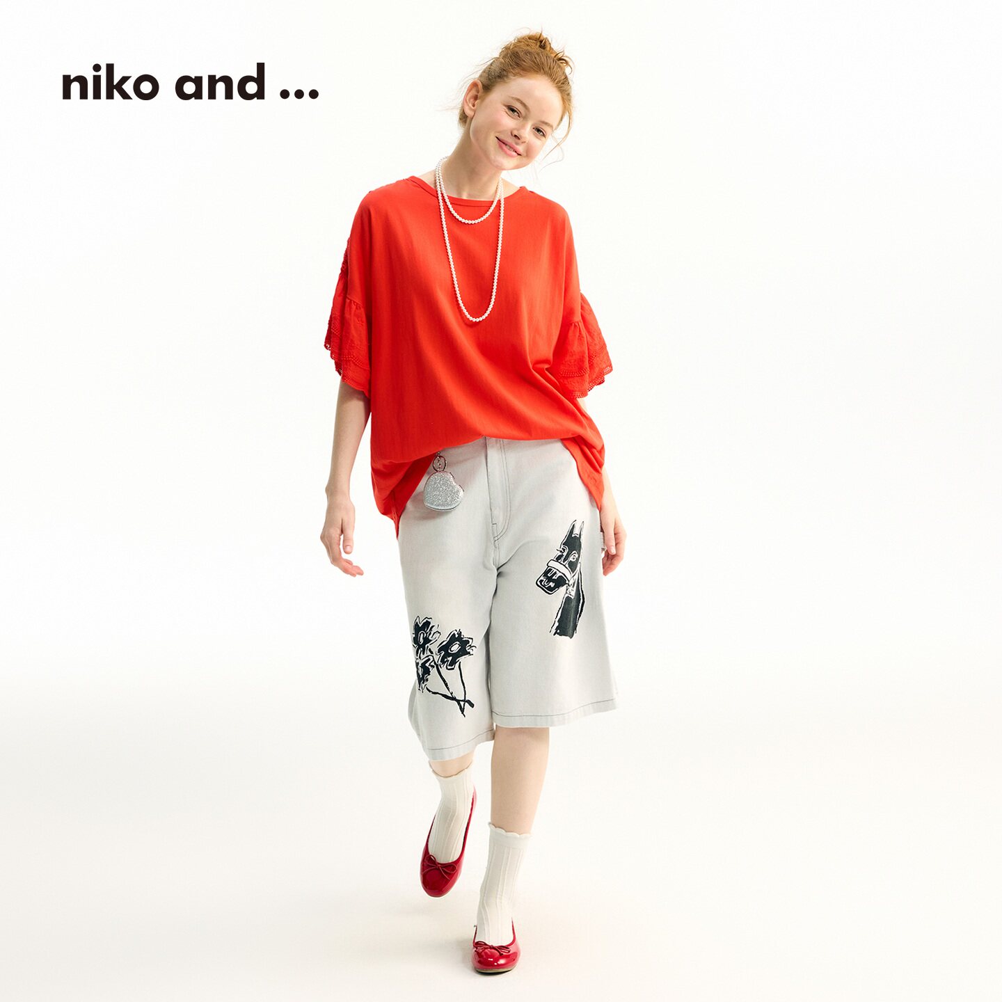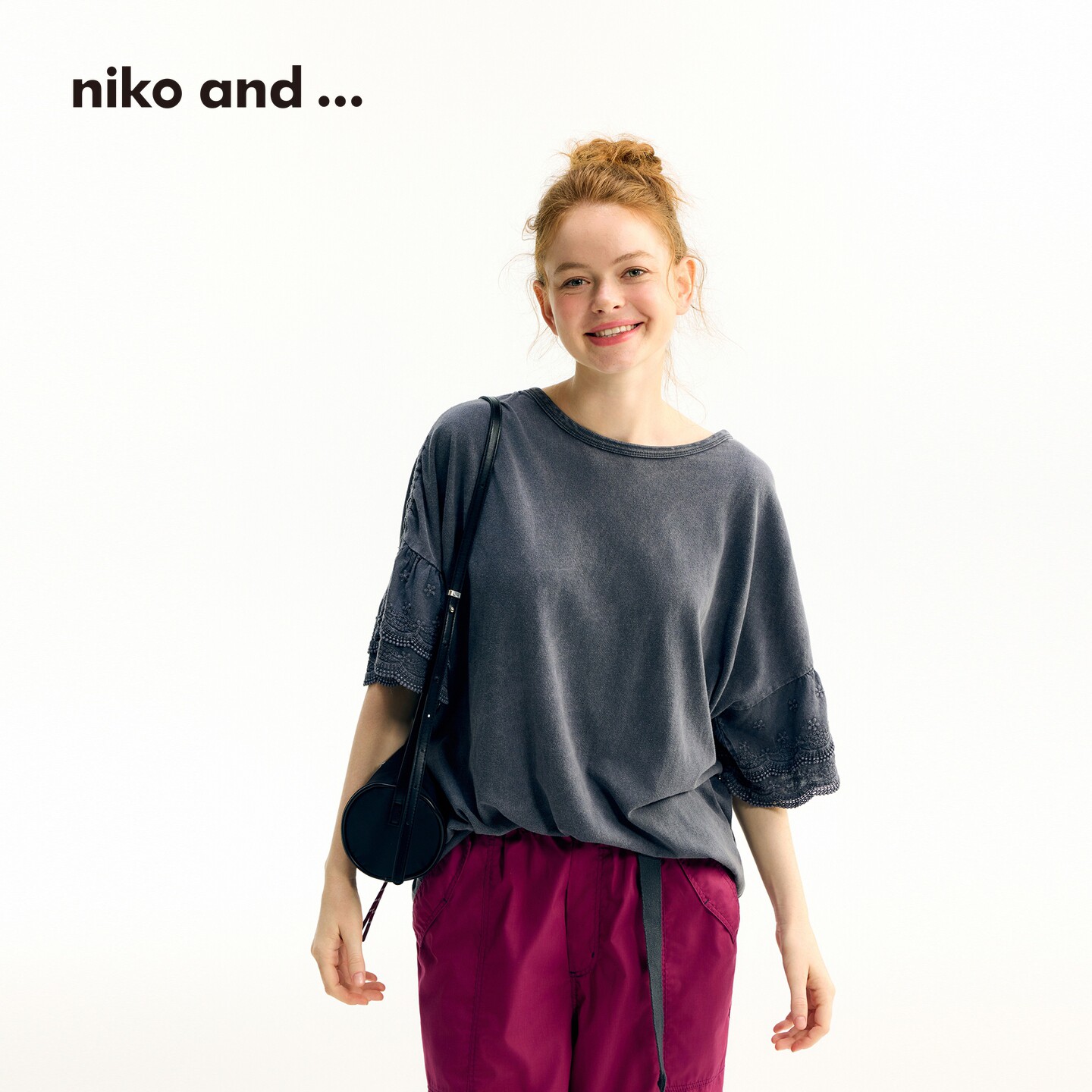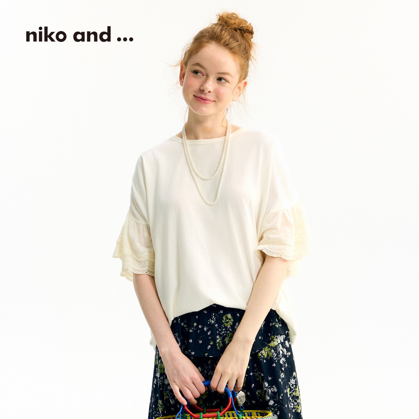niko and …T恤女2025年夏季新款简约复古蕾丝拼接短袖上衣323714