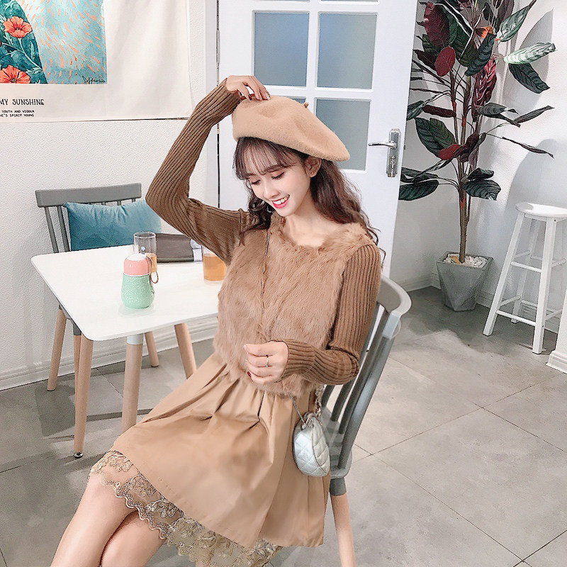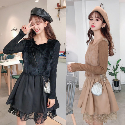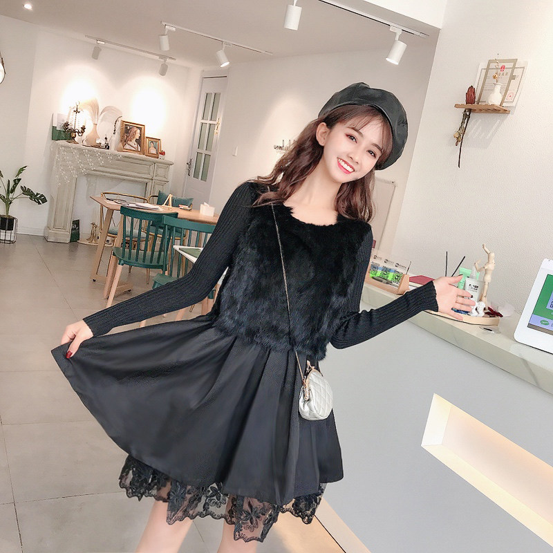 清仓2025秋装新款真兔毛拼接蕾丝收腰显瘦连衣裙学生轻奢女装