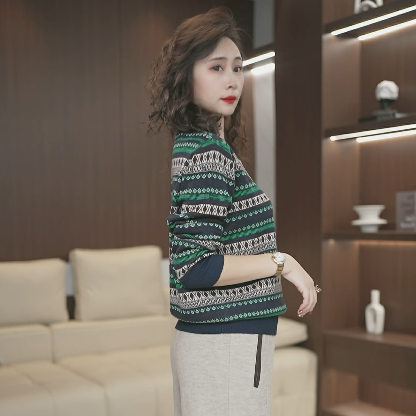 秋冬中年女士长袖加厚羊毛衫条纹圆领妈妈装针织打底衫毛衣3441