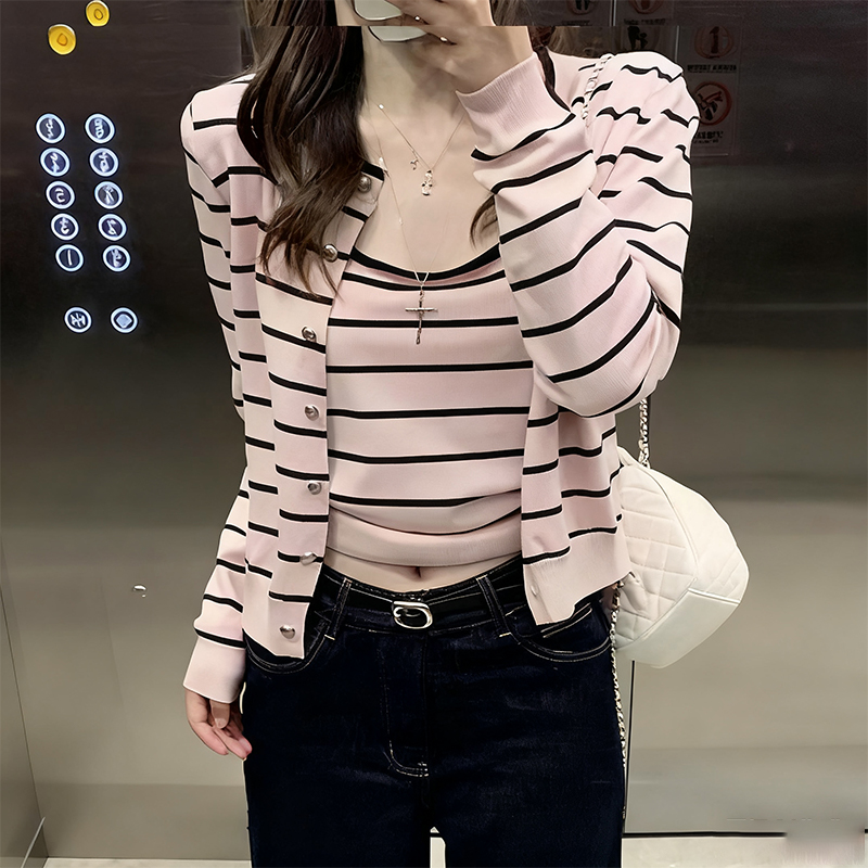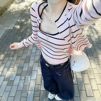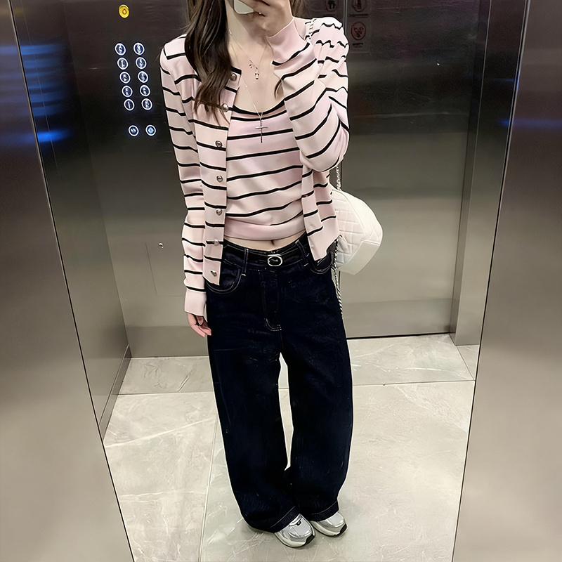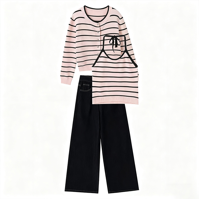韩系时尚条纹针织背心修身长袖开衫毛衣女秋休闲阔腿牛仔裤三件套