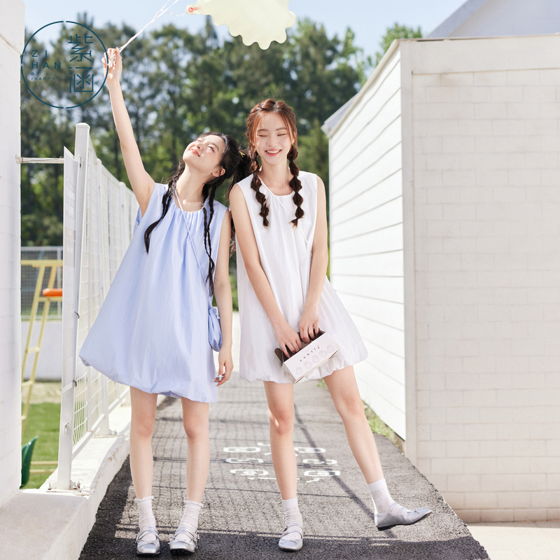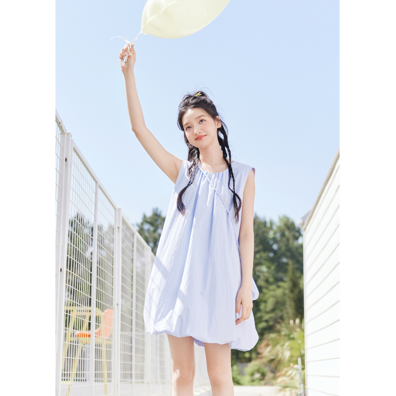 紫涵背心连衣裙2025年夏季新款甜美花苞裙设计感褶皱圆领纯色裙子