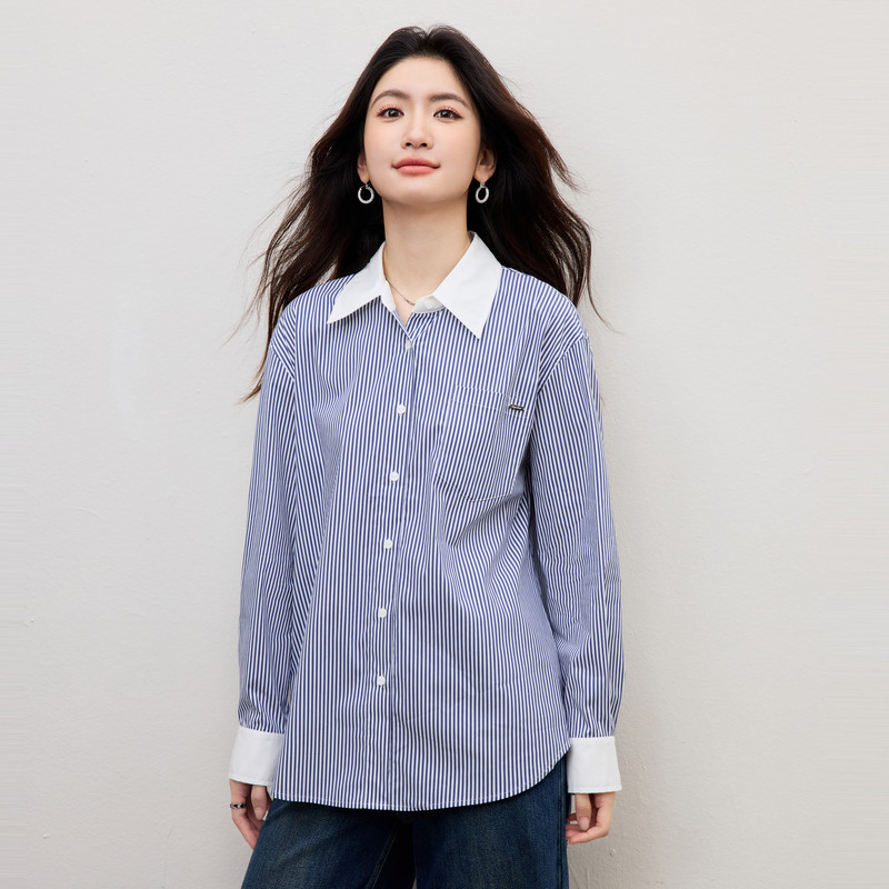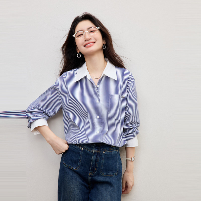 蓝色条纹衬衫2026春季新款百搭女装微落肩单排扣翻领气质休闲上衣