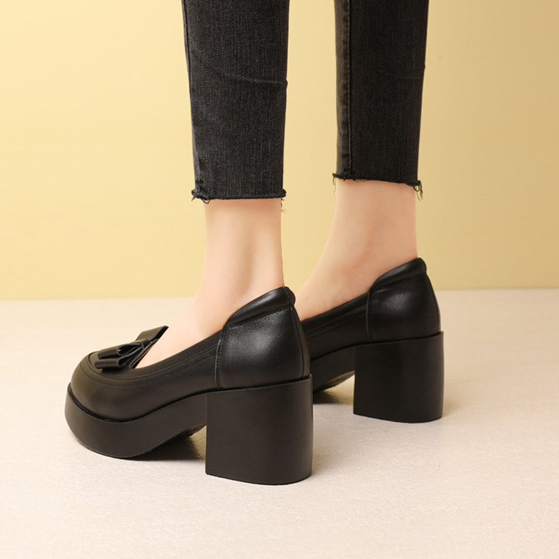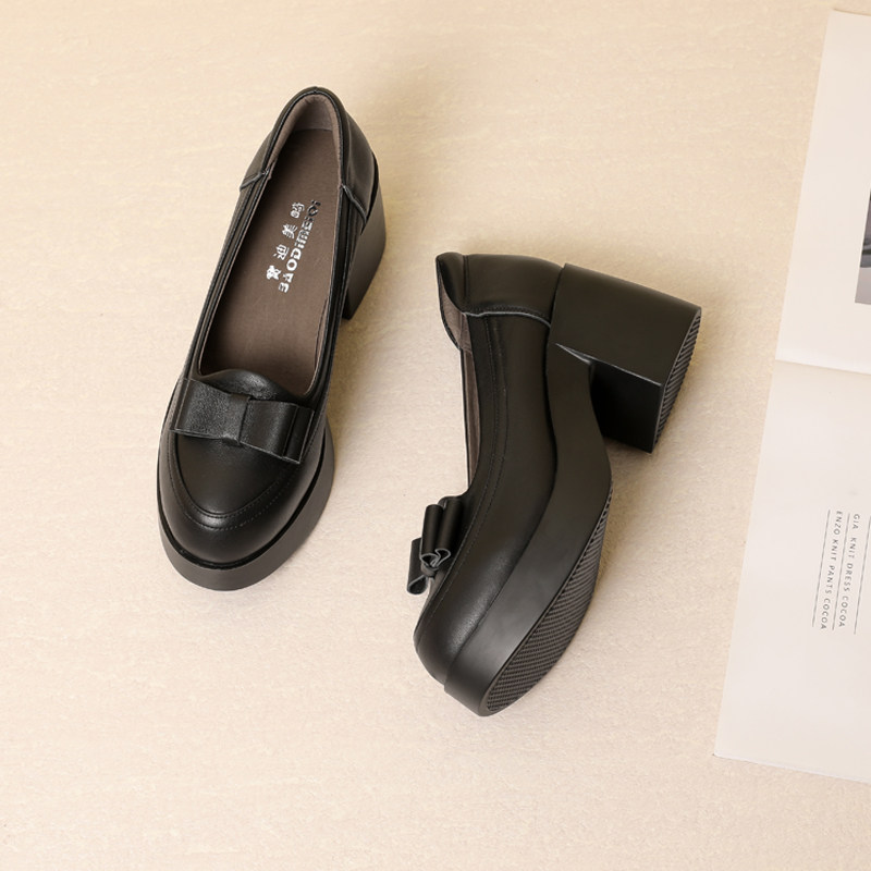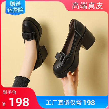 高跟鞋女2023年新款真皮圆头浅口坡跟厚底仙女风小皮鞋一脚蹬单鞋