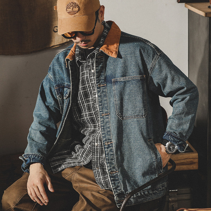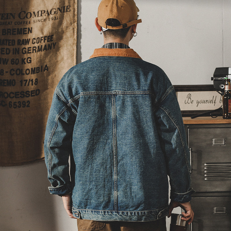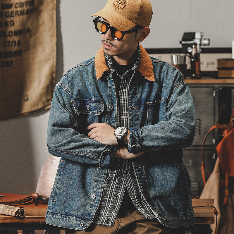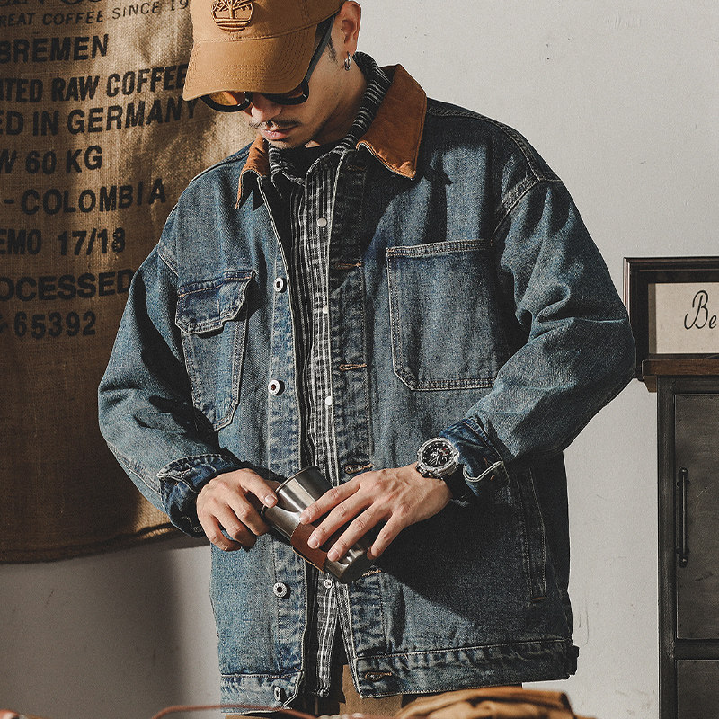 美式复古拼色牛仔外套男春秋