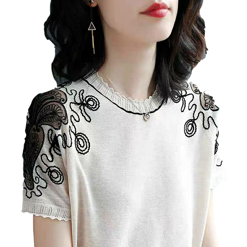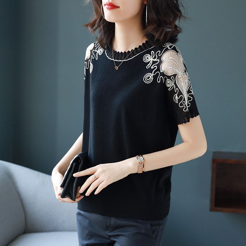 欧洲站圆领时尚蕾丝针织短袖t恤女2020新款休闲潮流甜美打底衫