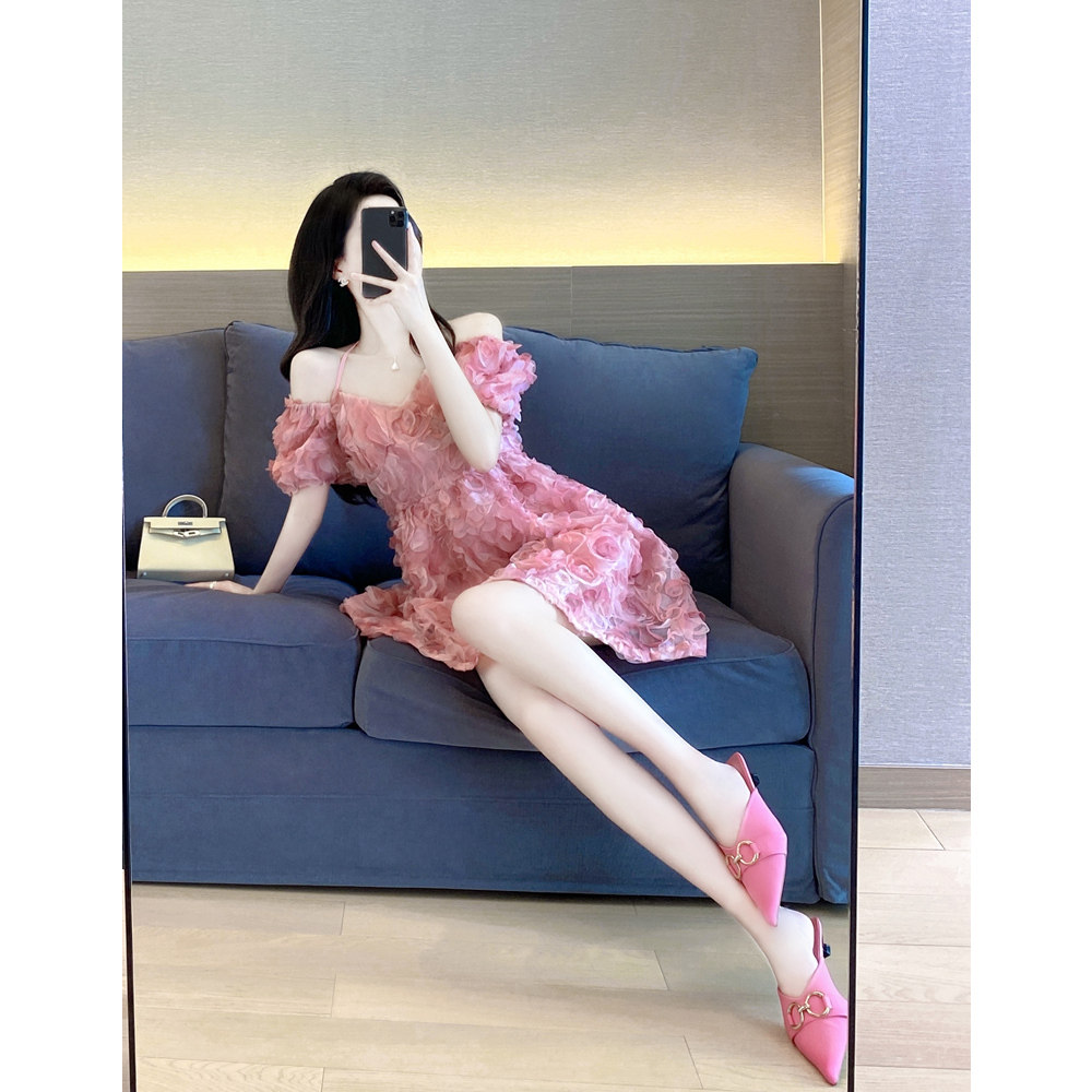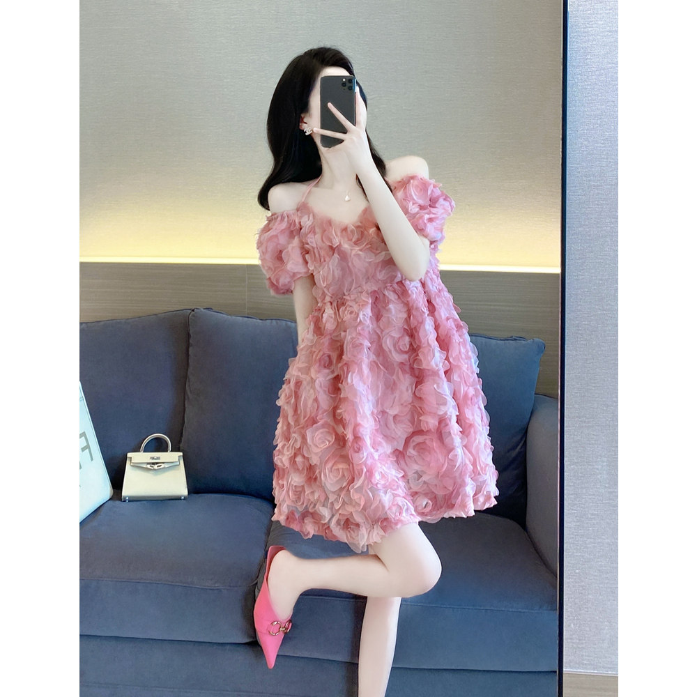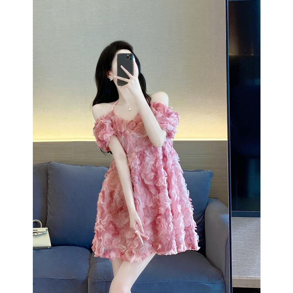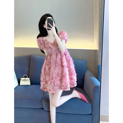 粉色碎花连衣裙女夏2024新款法式气质名媛立体玫瑰花瓣甜美蓬蓬裙