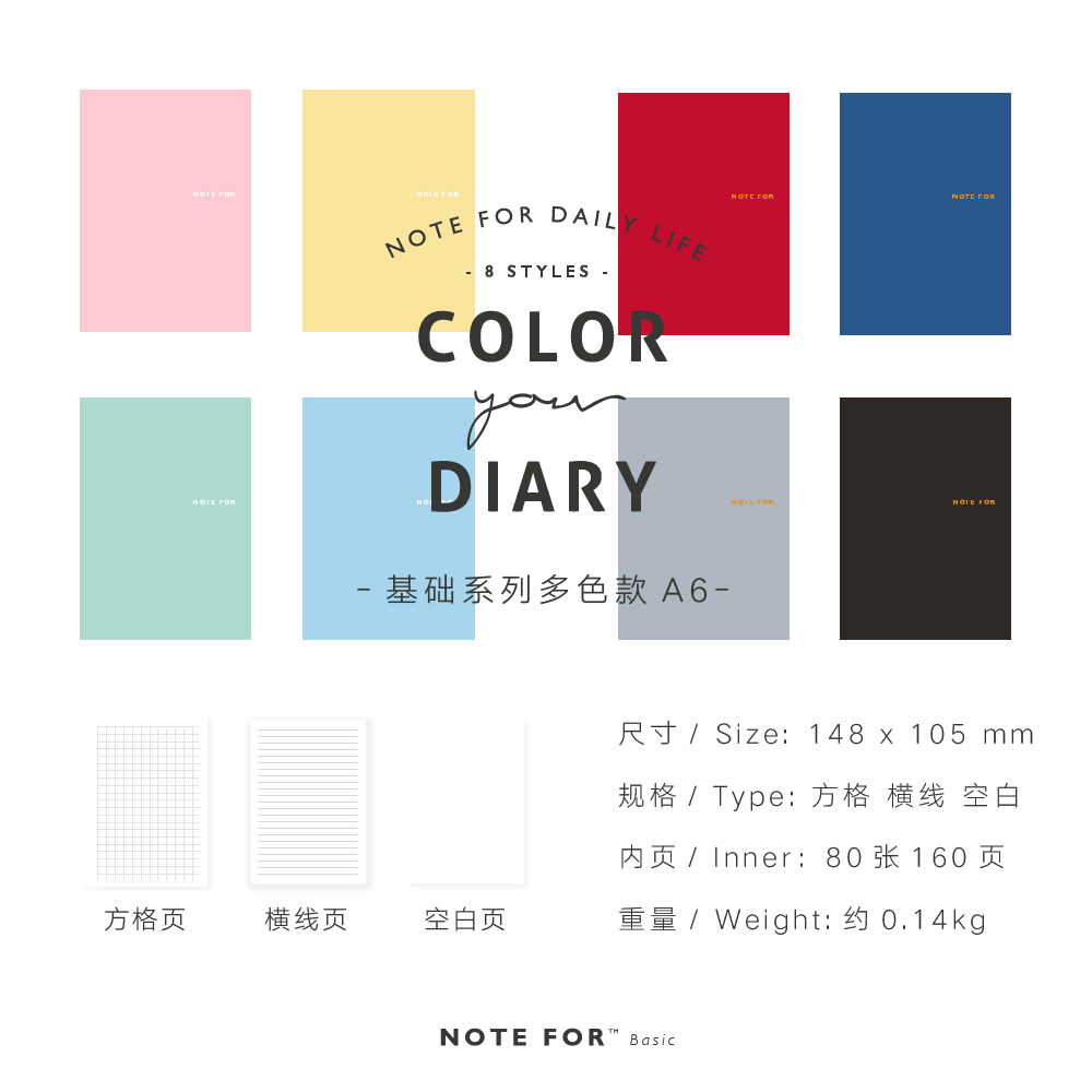 NOTE FOR多色基础手账本A6内芯笔记本文具纯色经典方格横线空白本