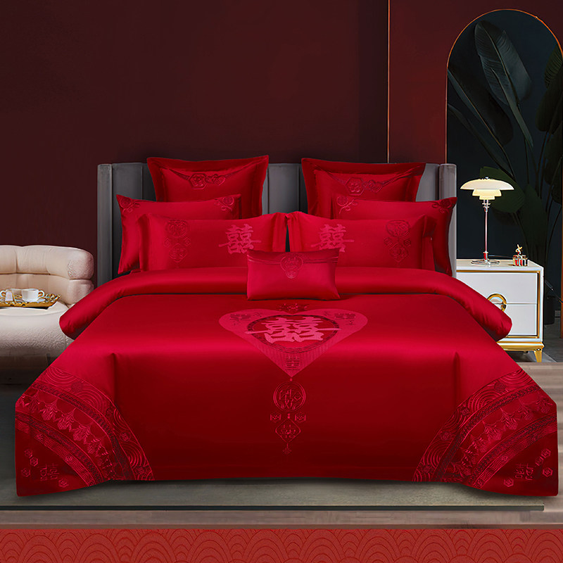 婚庆牀组被套四件套大红色全绣花简约婚房牀单结新婚被罩4件