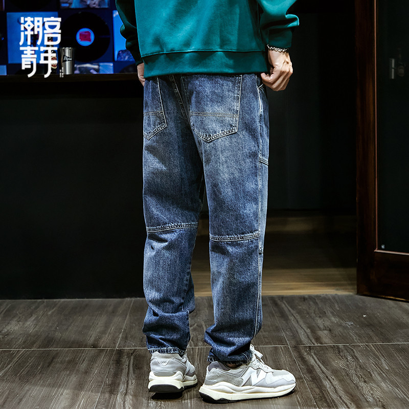 秋冬拼接牛仔裤男士宽松大码裤子青年休闲锥形直筒裤秋季潮牌长裤