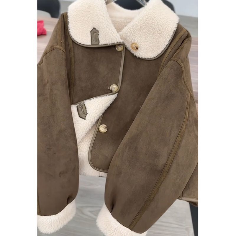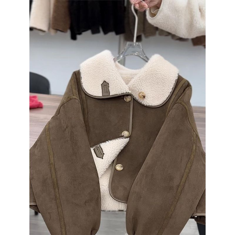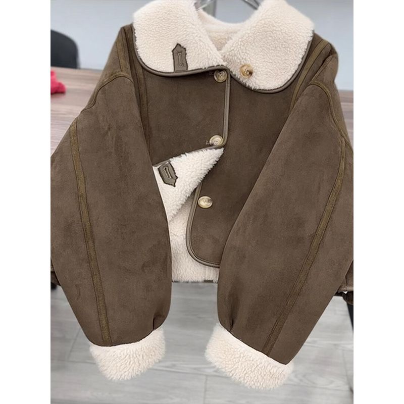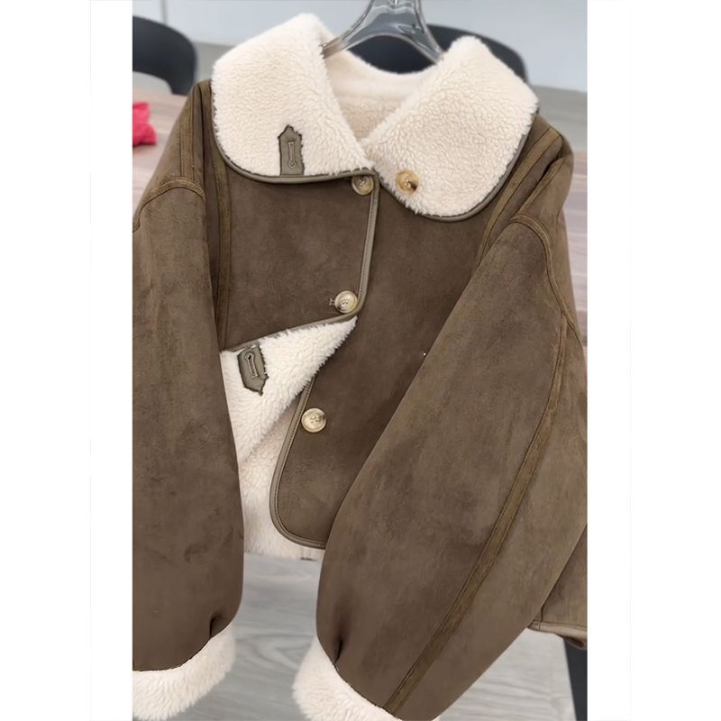 咖色麂皮绒皮毛一体外套女冬季