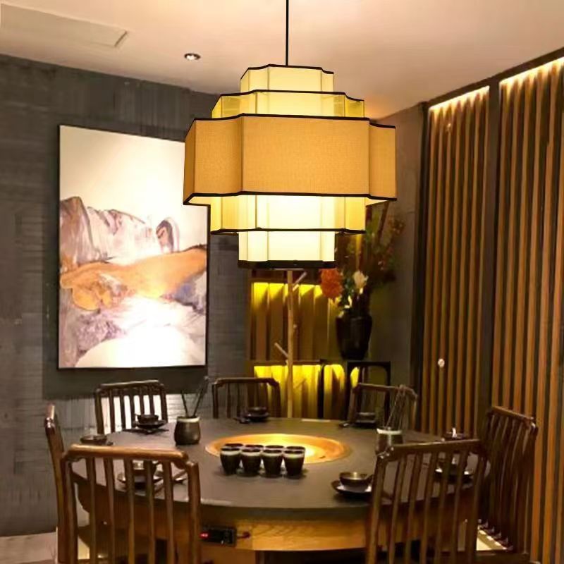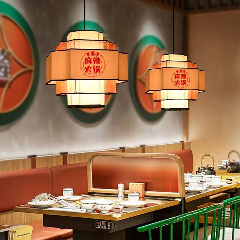 2025新款中式铁艺灯笼火锅店餐桌吊灯带射灯饭店卡座亚麻布艺灯具