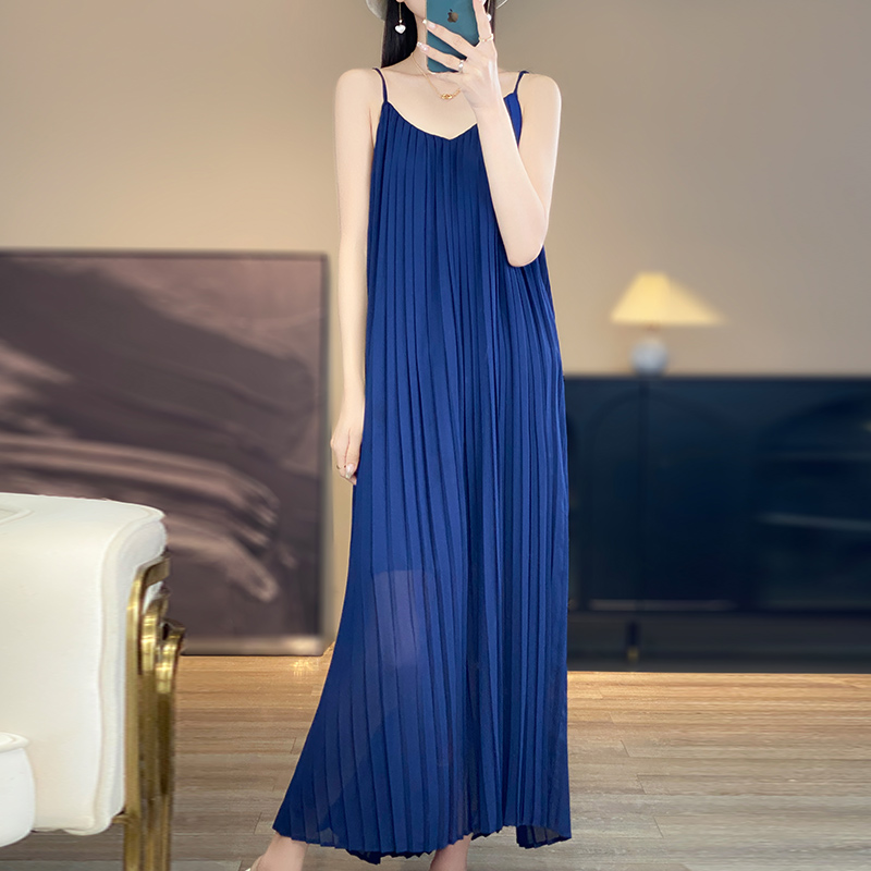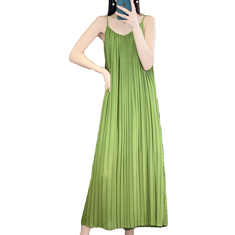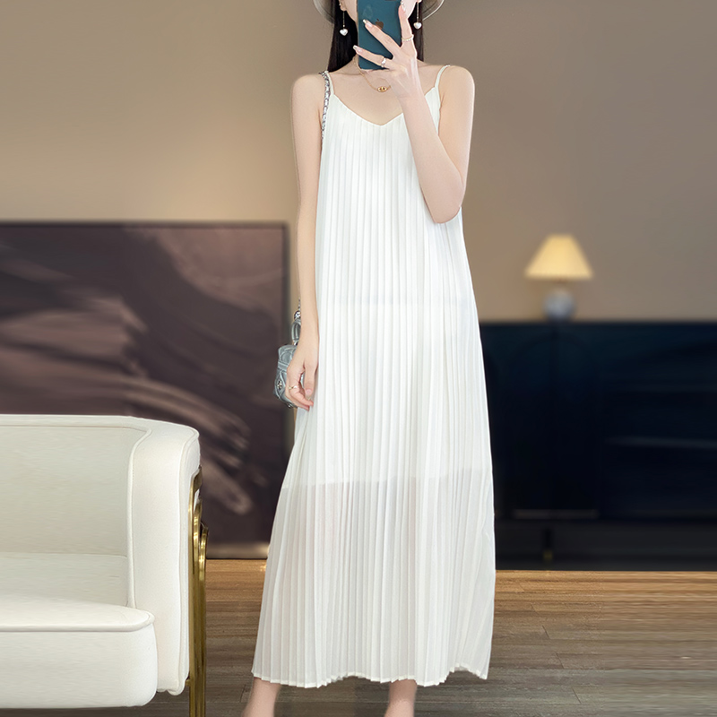 法式浪漫吊带连衣裙女2024新款夏季海边度假休闲百褶显瘦白色长裙
