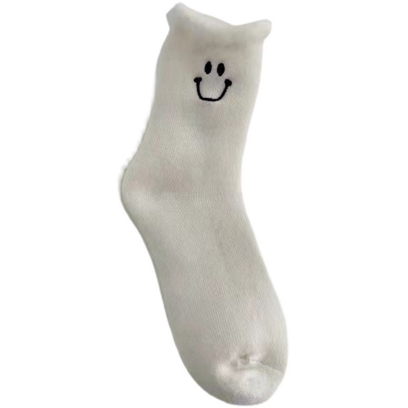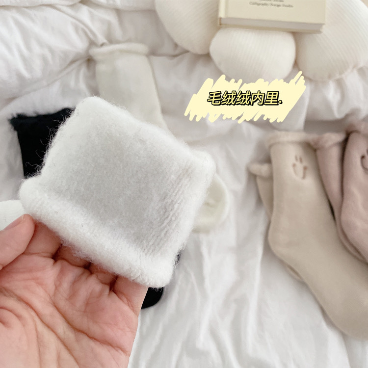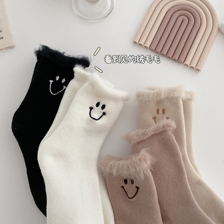 冬天加厚刺绣笑脸女中筒袜刷绒保暖厚袜子家居袜地板袜韩国女袜子