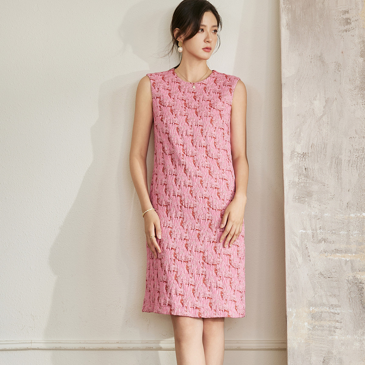 罗衣高级浮雕提花连衣裙女2025夏季新款甜美粉色无袖直筒裙10304