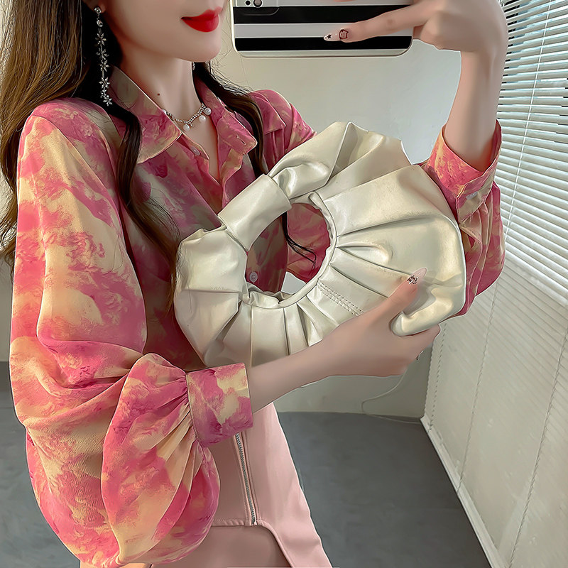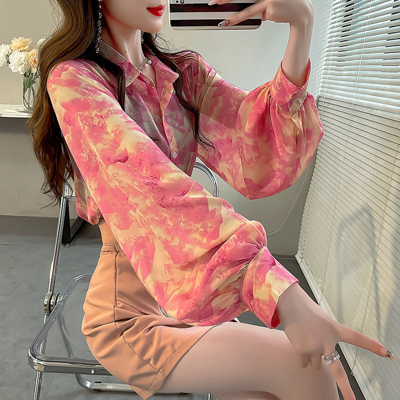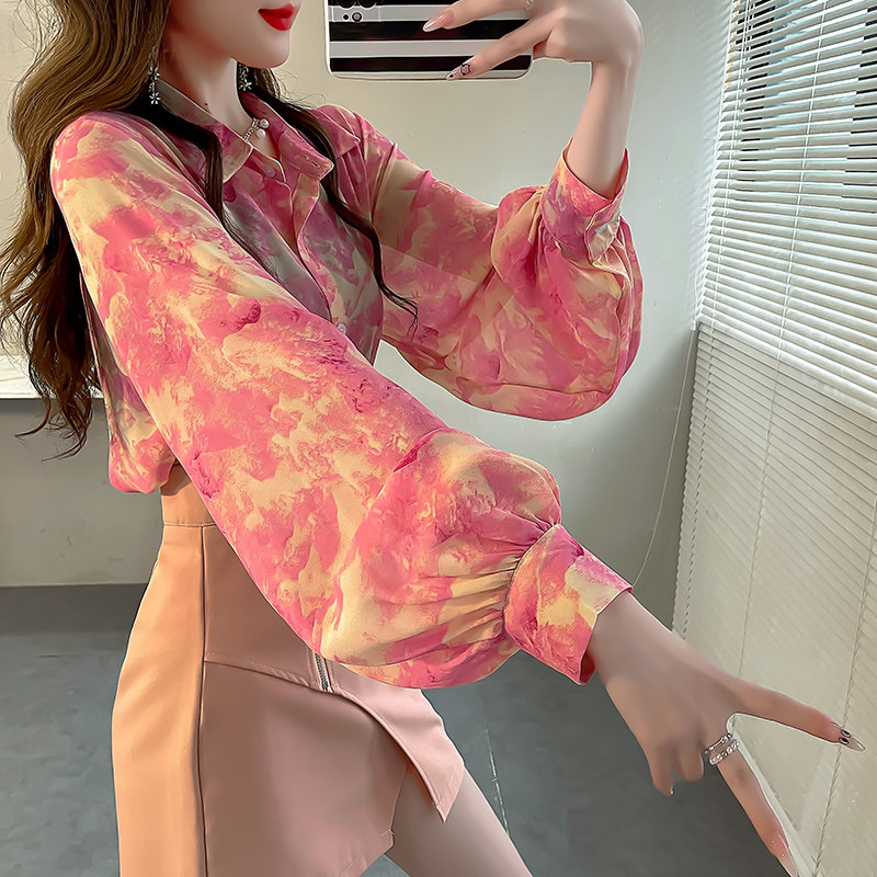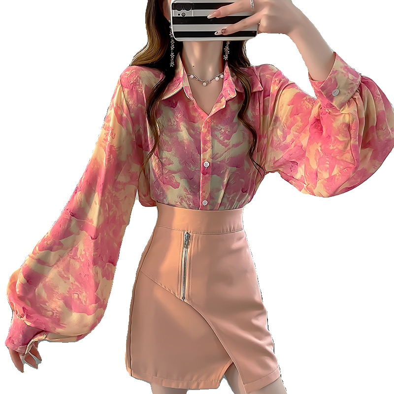 粉色独特别致印花衬衫女2024年新款时尚灯笼袖衬衣显瘦雪纺上衣仙