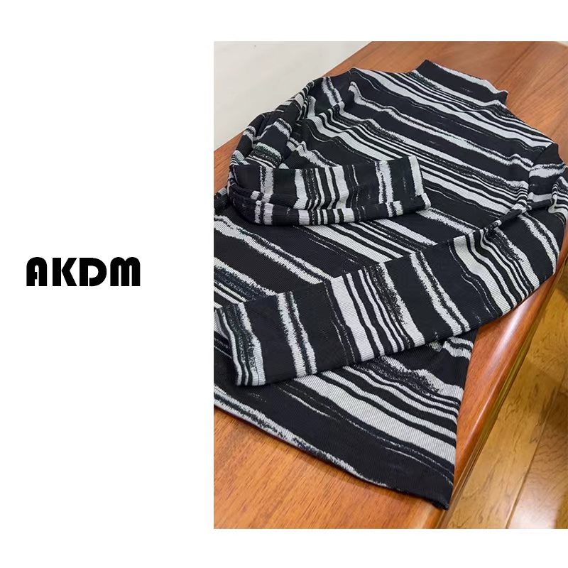 AKDM条纹长袖半高领高弹打底小衫女秋冬款T恤5855