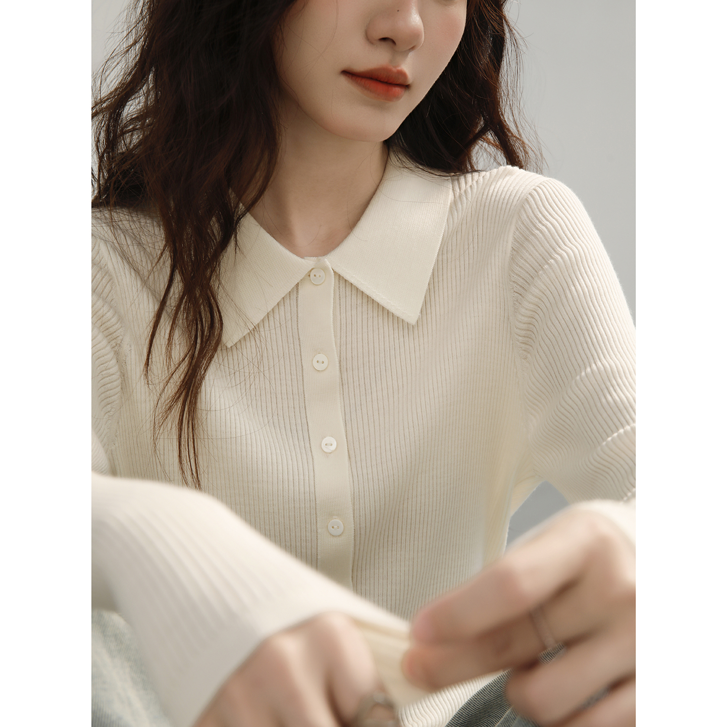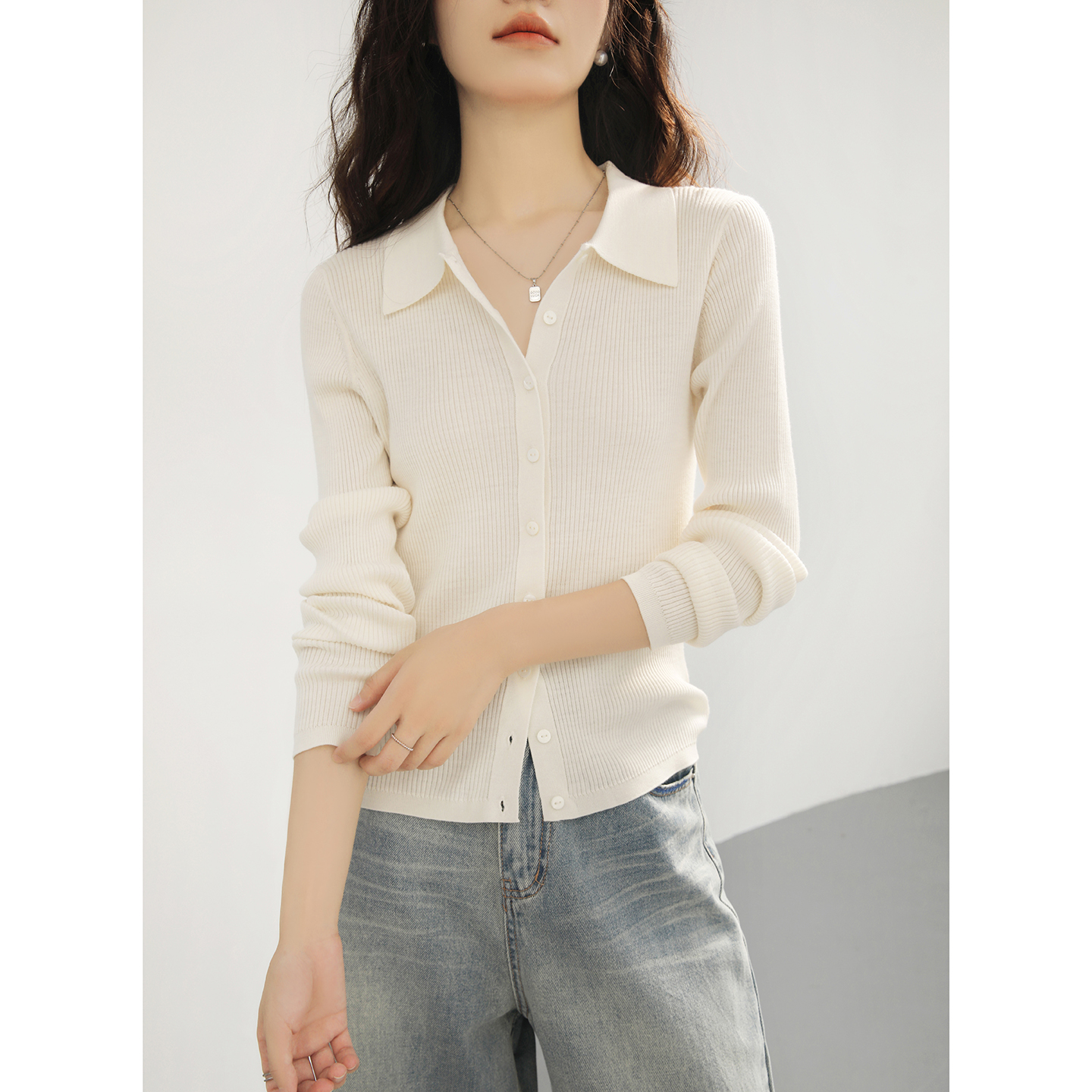 白色POLO领针织开衫女2025新款显瘦内搭48支细绵羊毛打底衫上衣秋