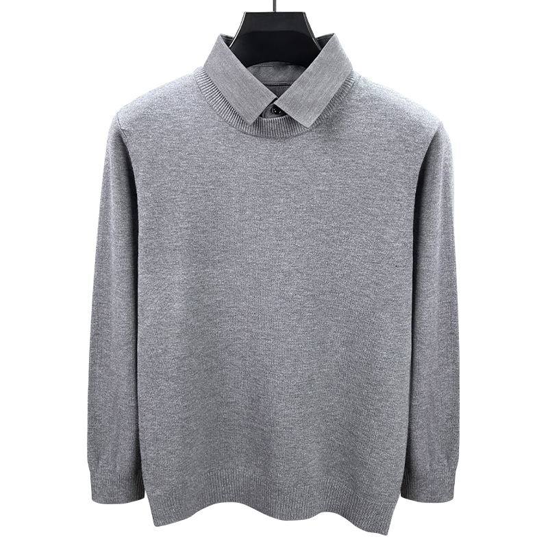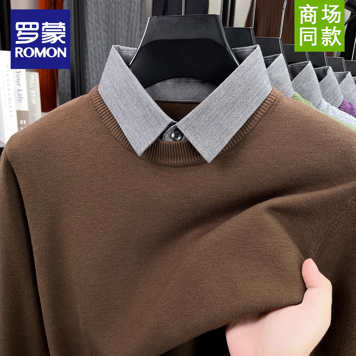 罗蒙2025秋冬季衬衫领纯色假两件针织衫商务休闲长袖打底毛衣