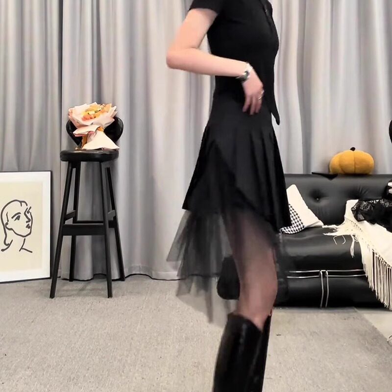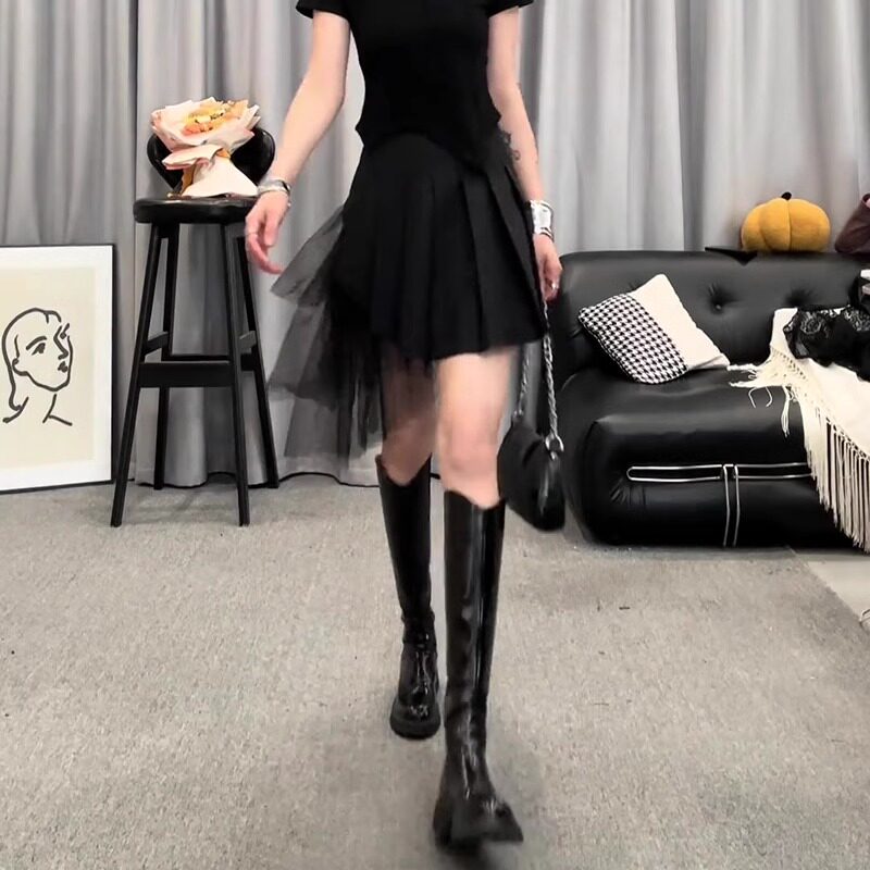 黑色网纱拼接百褶短裙2025夏季流行新款高腰减龄时尚百搭A字半裙