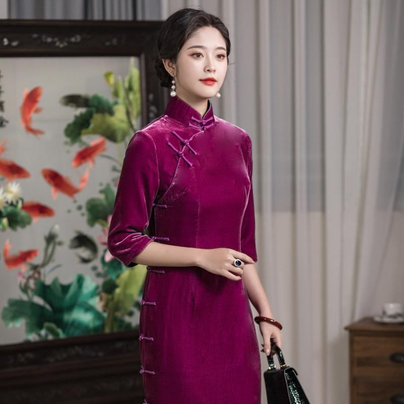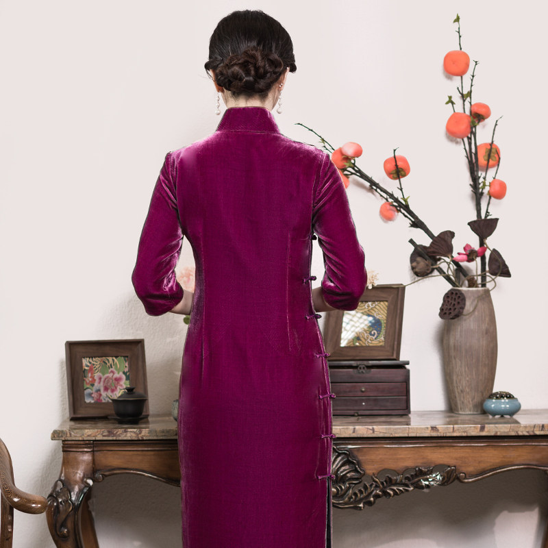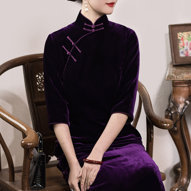 回忆曲三重门2025新款真丝丝绒中国风树莓紫旗袍女桑蚕丝优雅复古