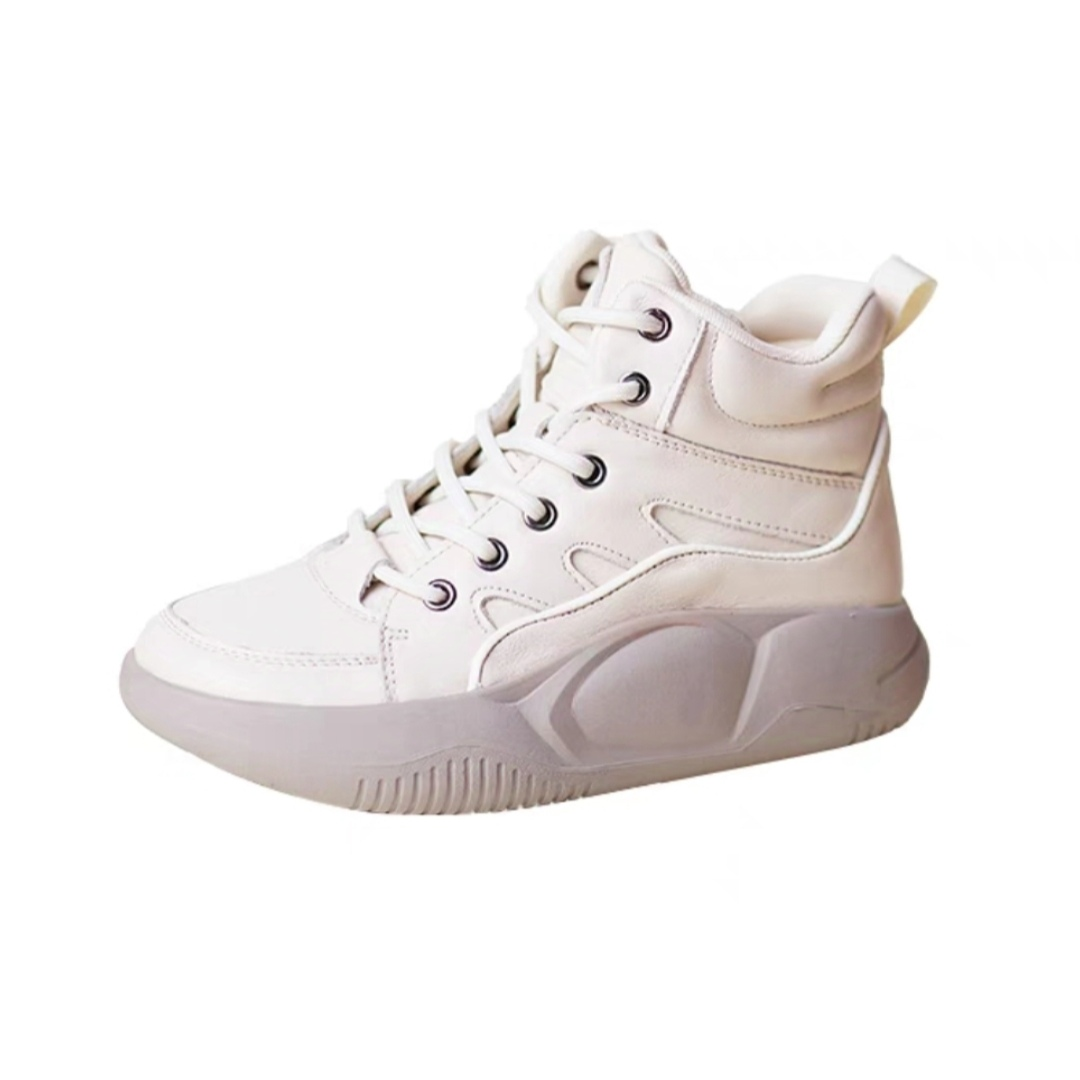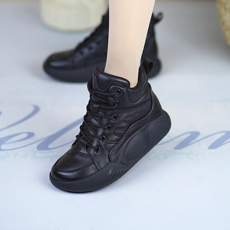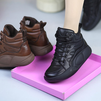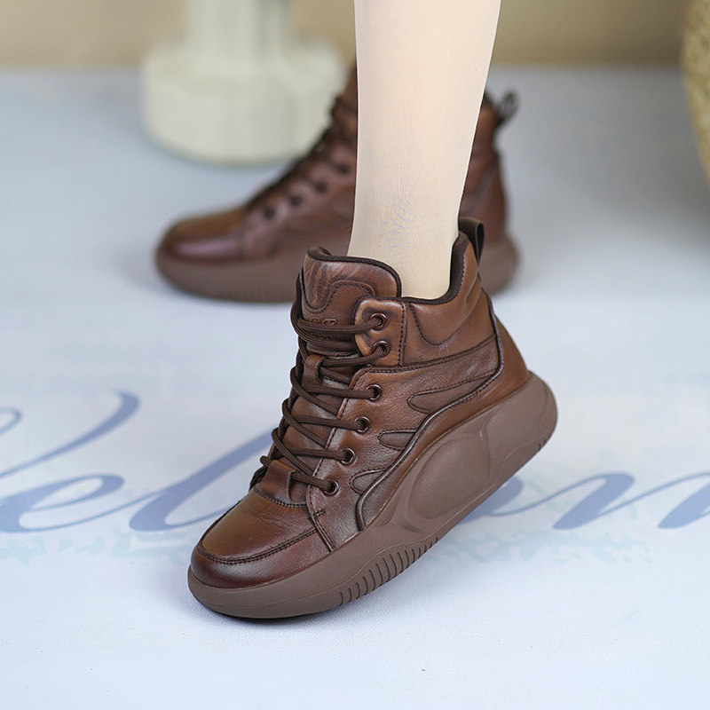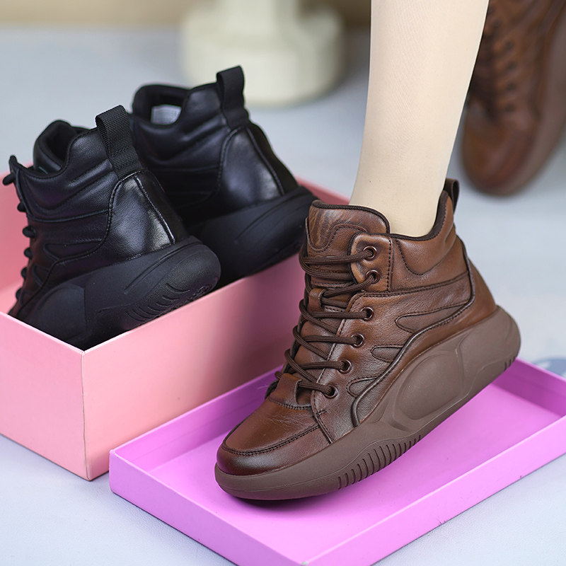 真皮高帮休闲鞋女秋冬新款复古平底短靴头层牛皮圆头系带面包靴