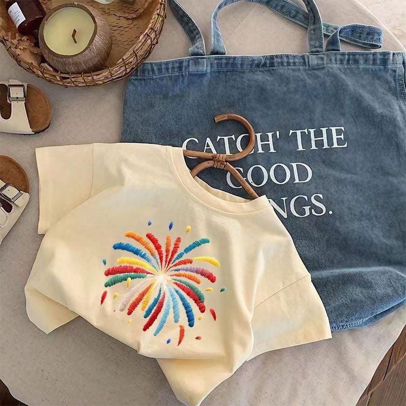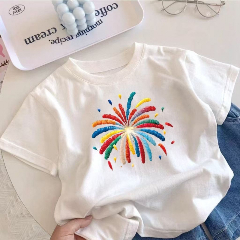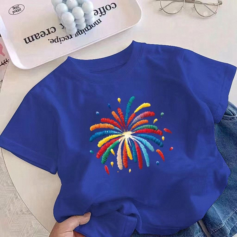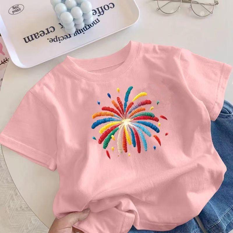 儿童纯棉短袖T恤男女童宝宝圆领趣味烟花百搭中小童新款夏季上衣