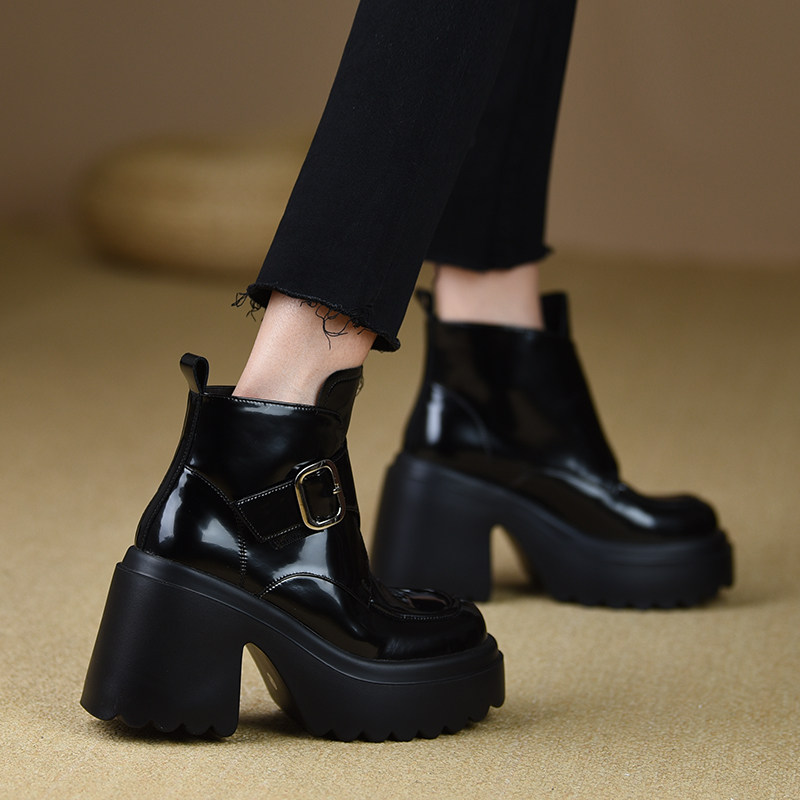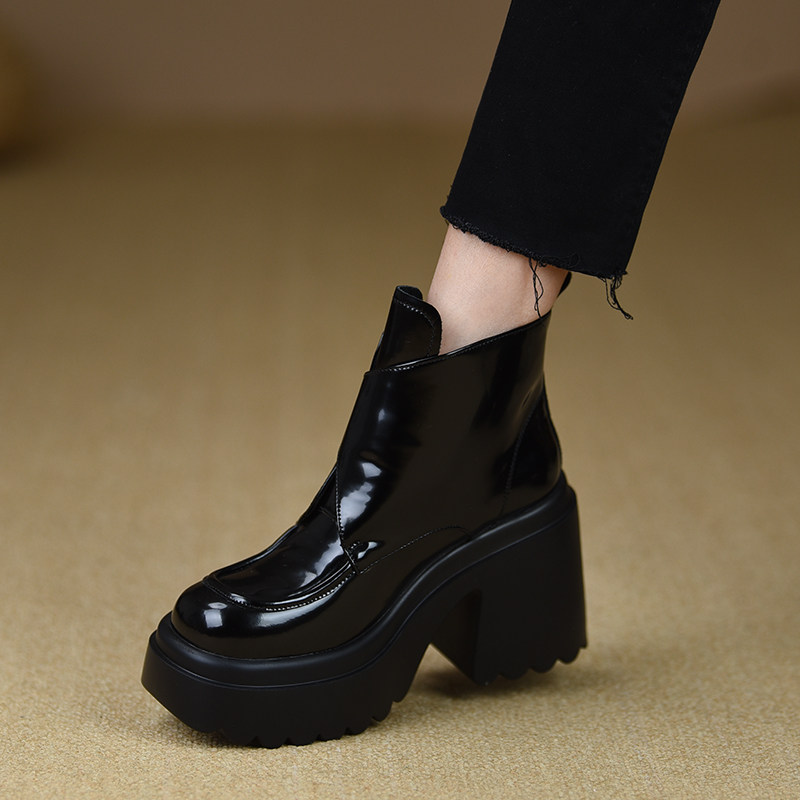 misili欧美粗跟厚底漆皮高跟短靴