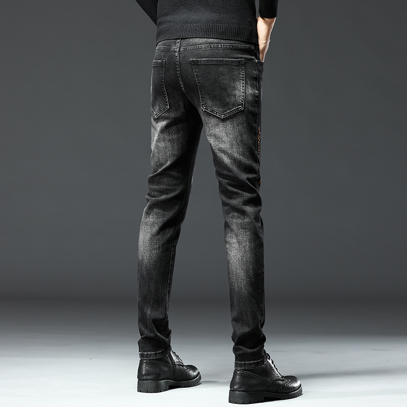 欧洲站黑色牛仔裤男潮牌弹力修身小脚小牛刺绣百搭休闲男士长裤子