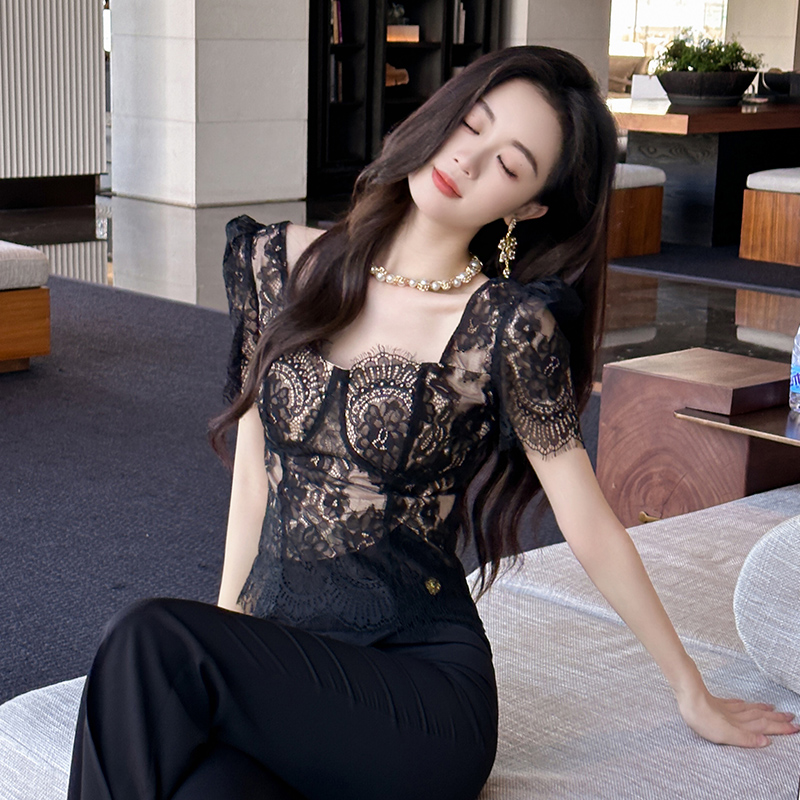 法式修身方领短袖上衣女夏季甜辣妹黑色蕾丝短款气质小衫2023新款