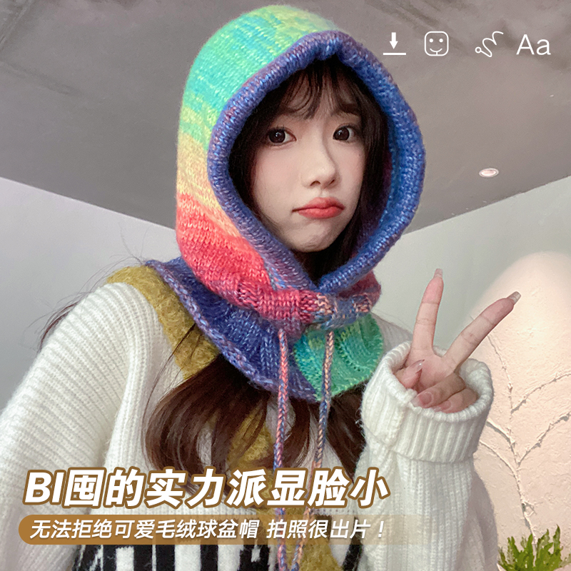 巴拉克拉法帽子彩色手工毛线帽围脖一体女冬季骑车保暖护耳针织帽