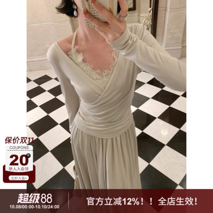 【杏云翩】SYT自制 法式挂脖蕾丝拼接花边设计三件套装收腰连衣裙