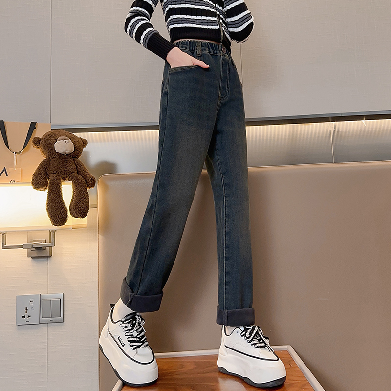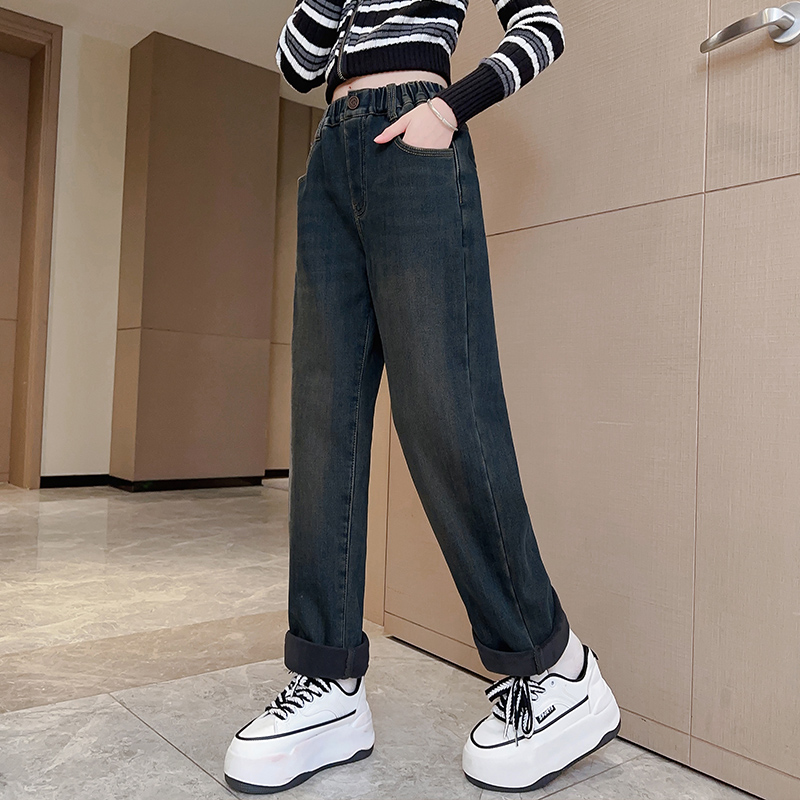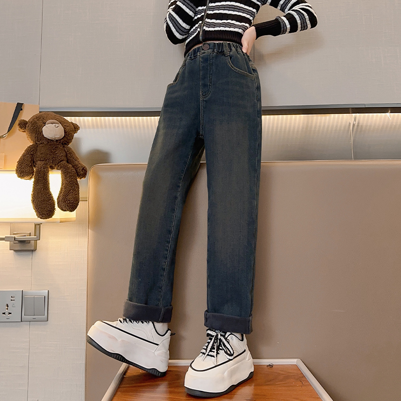 女童一体加绒牛仔裤直筒小脚裤冬