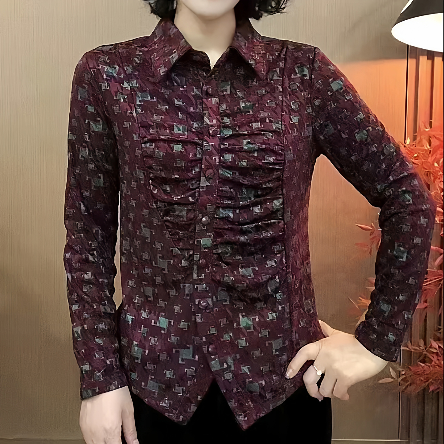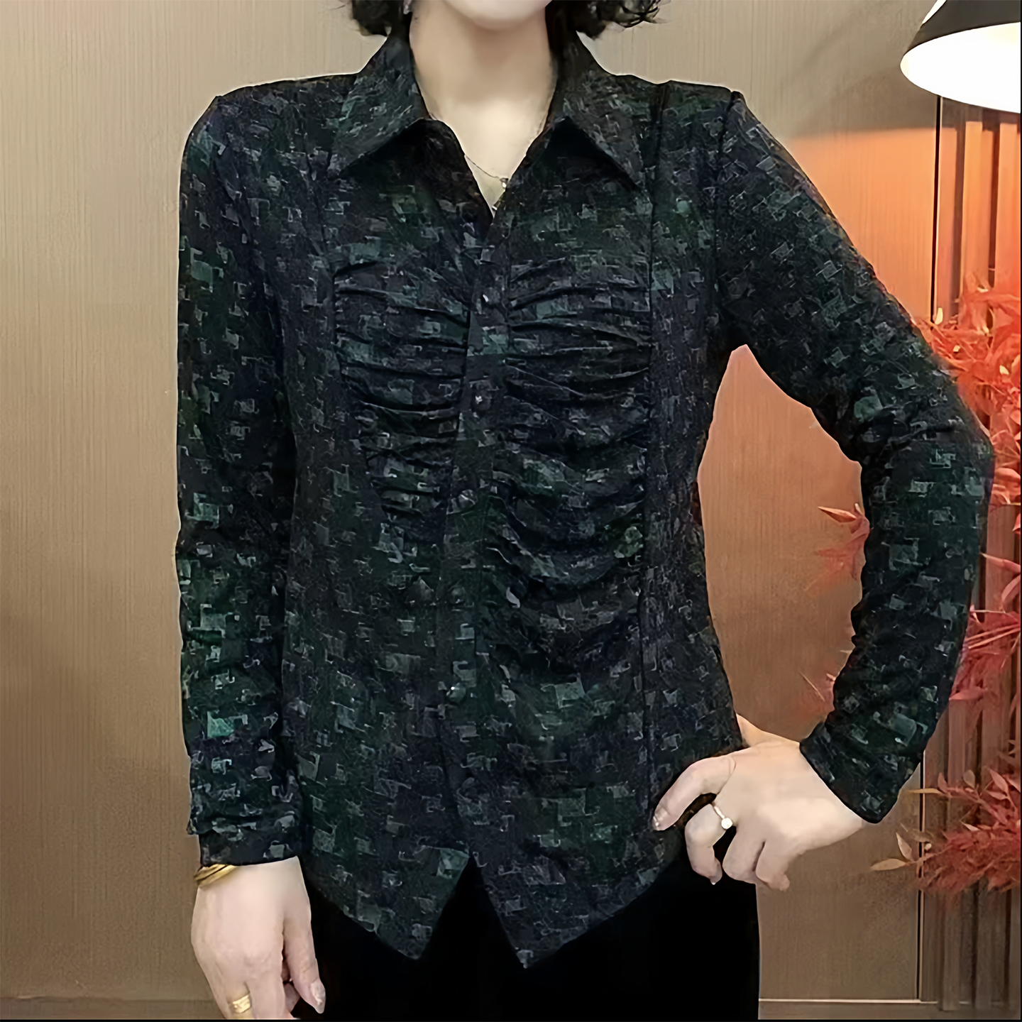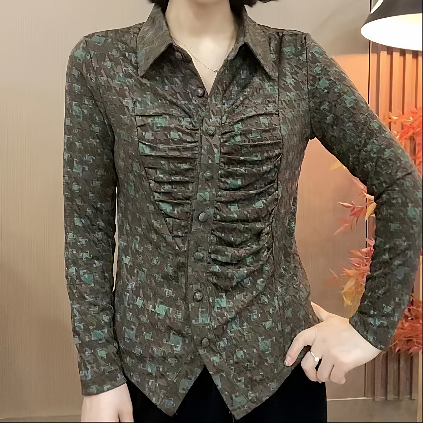 妈妈装秋季衬衫领斜门襟前褶皱印花长袖小衫百搭T恤打底衫女上衣
