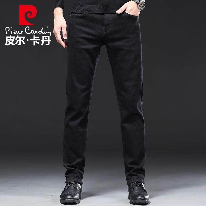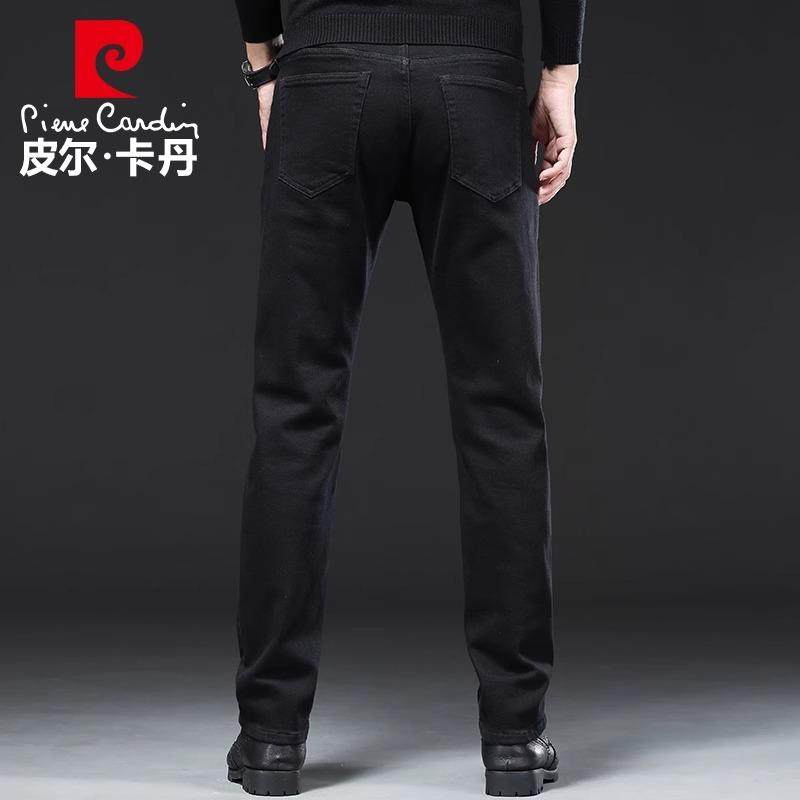 皮尔卡丹加绒牛仔裤男士秋冬季直筒宽松加厚款保暖黑色弹力长裤子