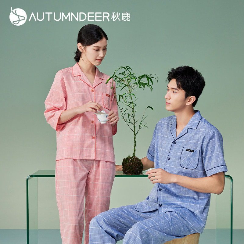 秋鹿情侣男女纯棉梭织国民领睡衣