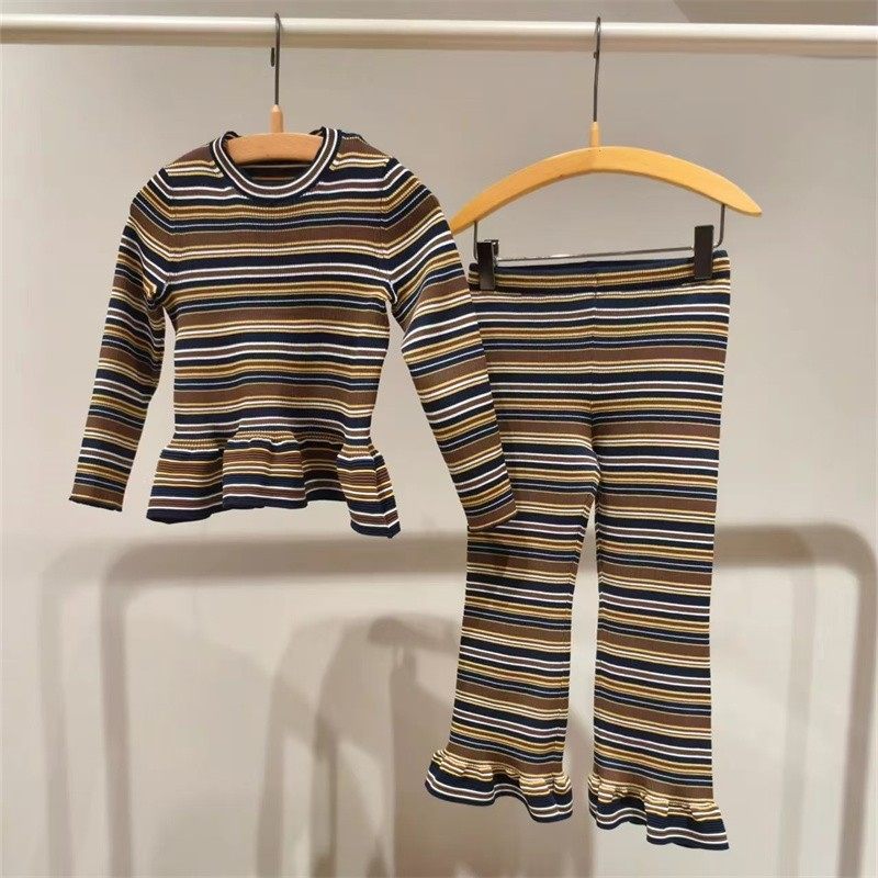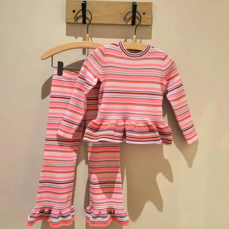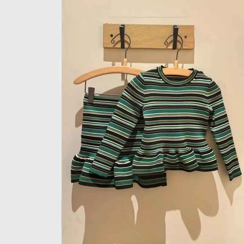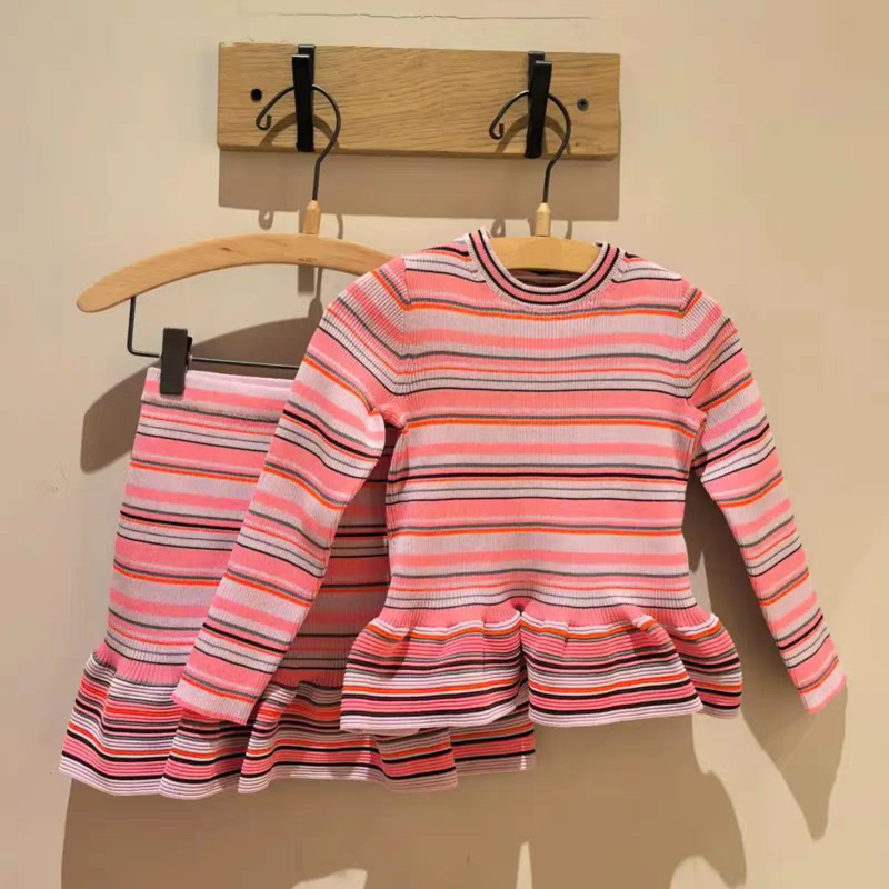 现货童装定制女童时尚拼色条纹套装儿童早春长袖套头毛衣鱼尾裙潮