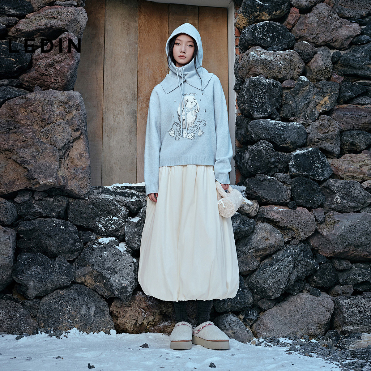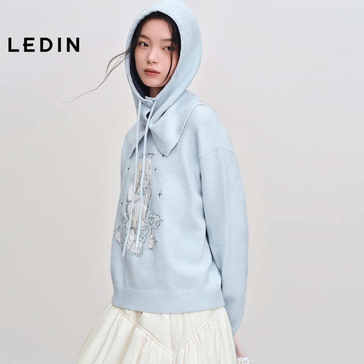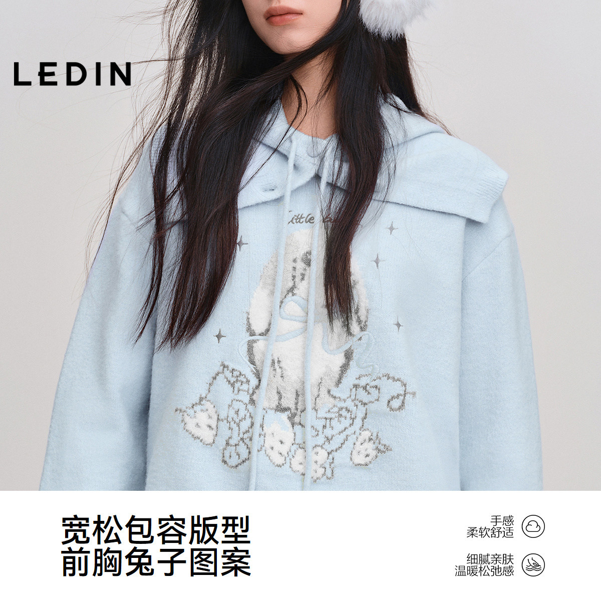乐町兔子绣花蓝色毛衣女25年冬季新款宽松带帽套头针织大图案上衣
