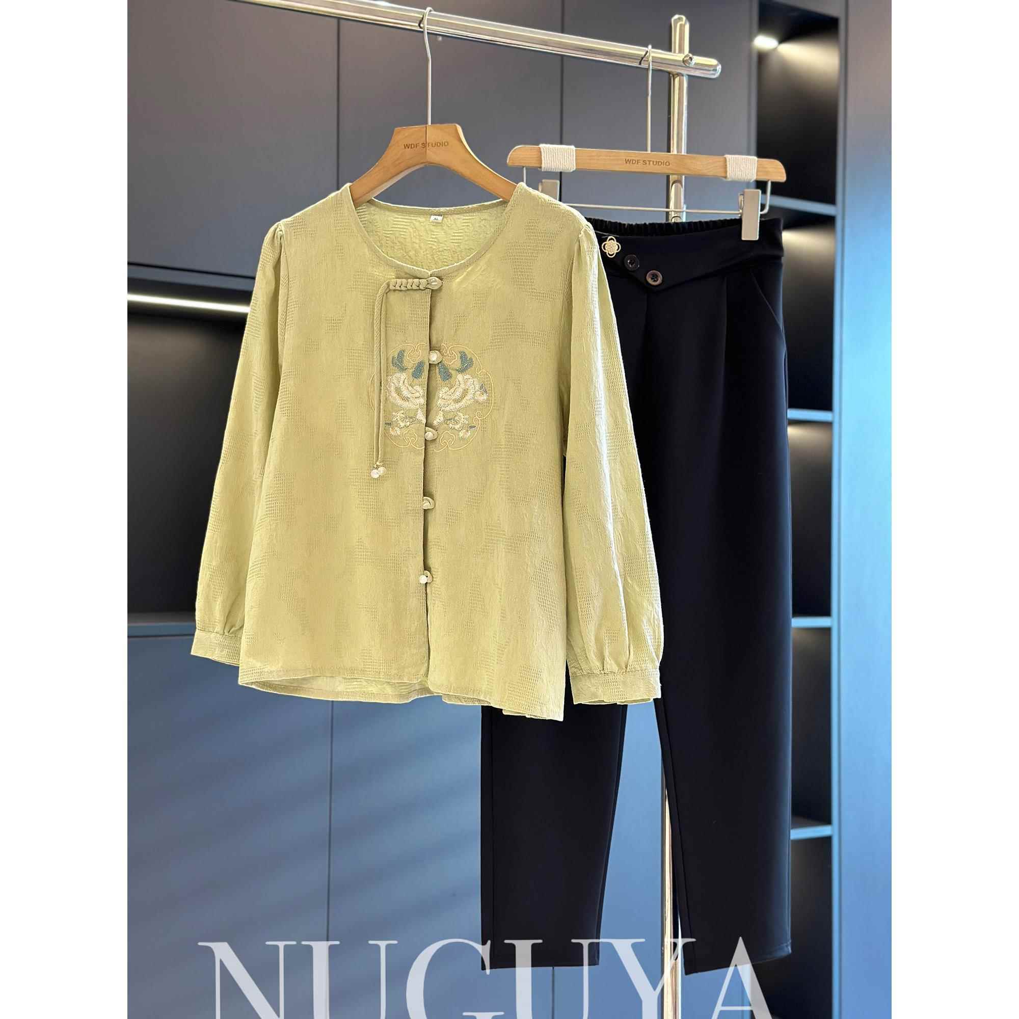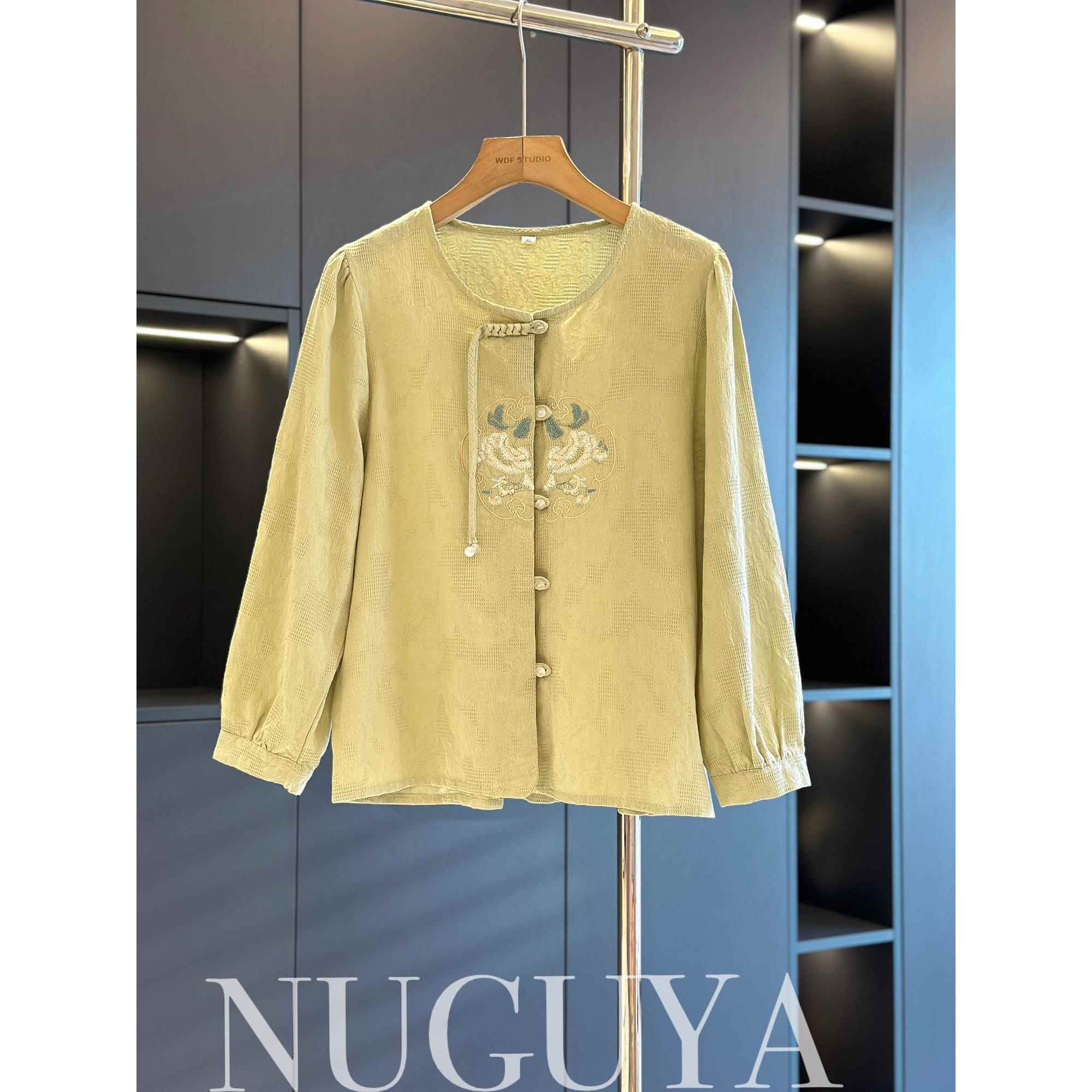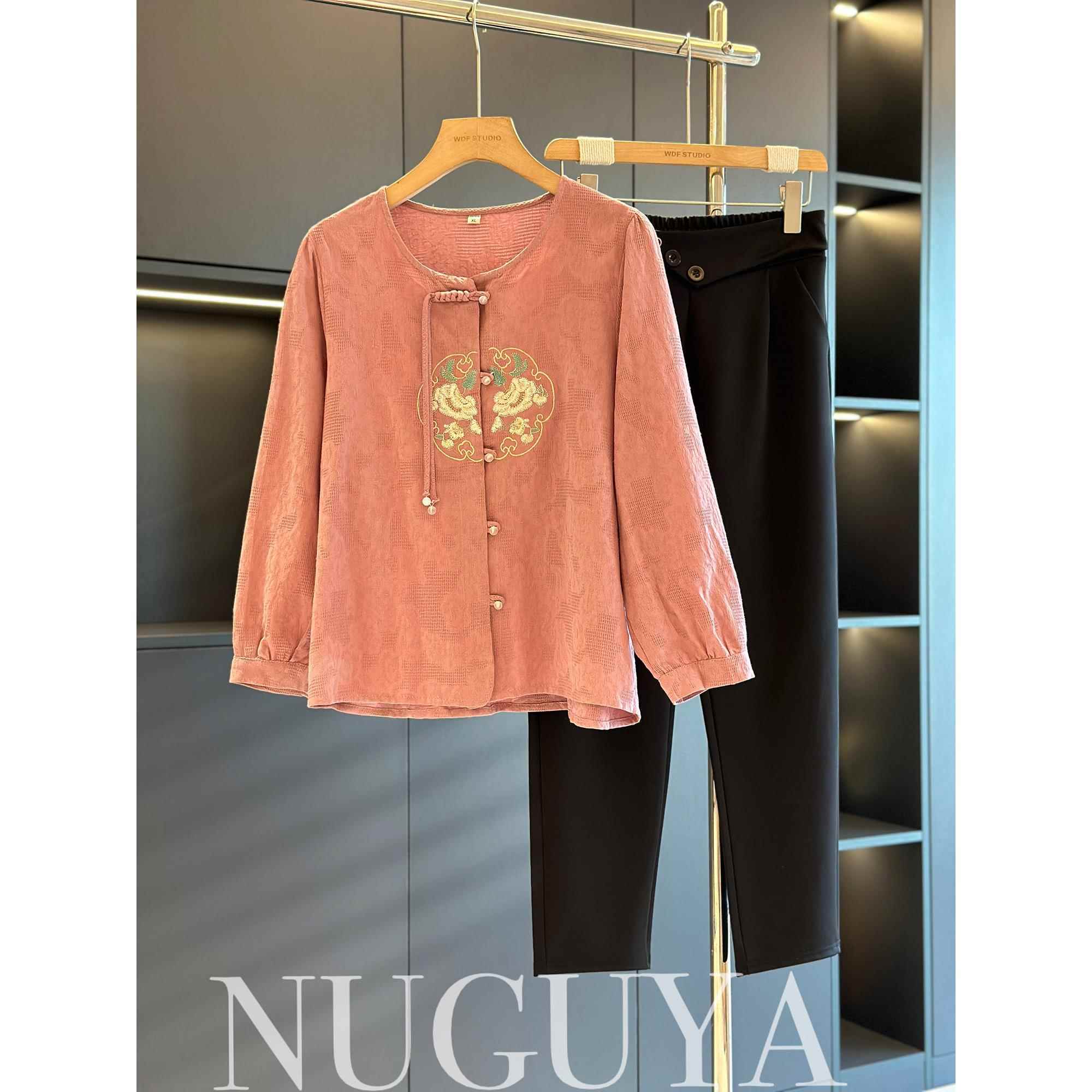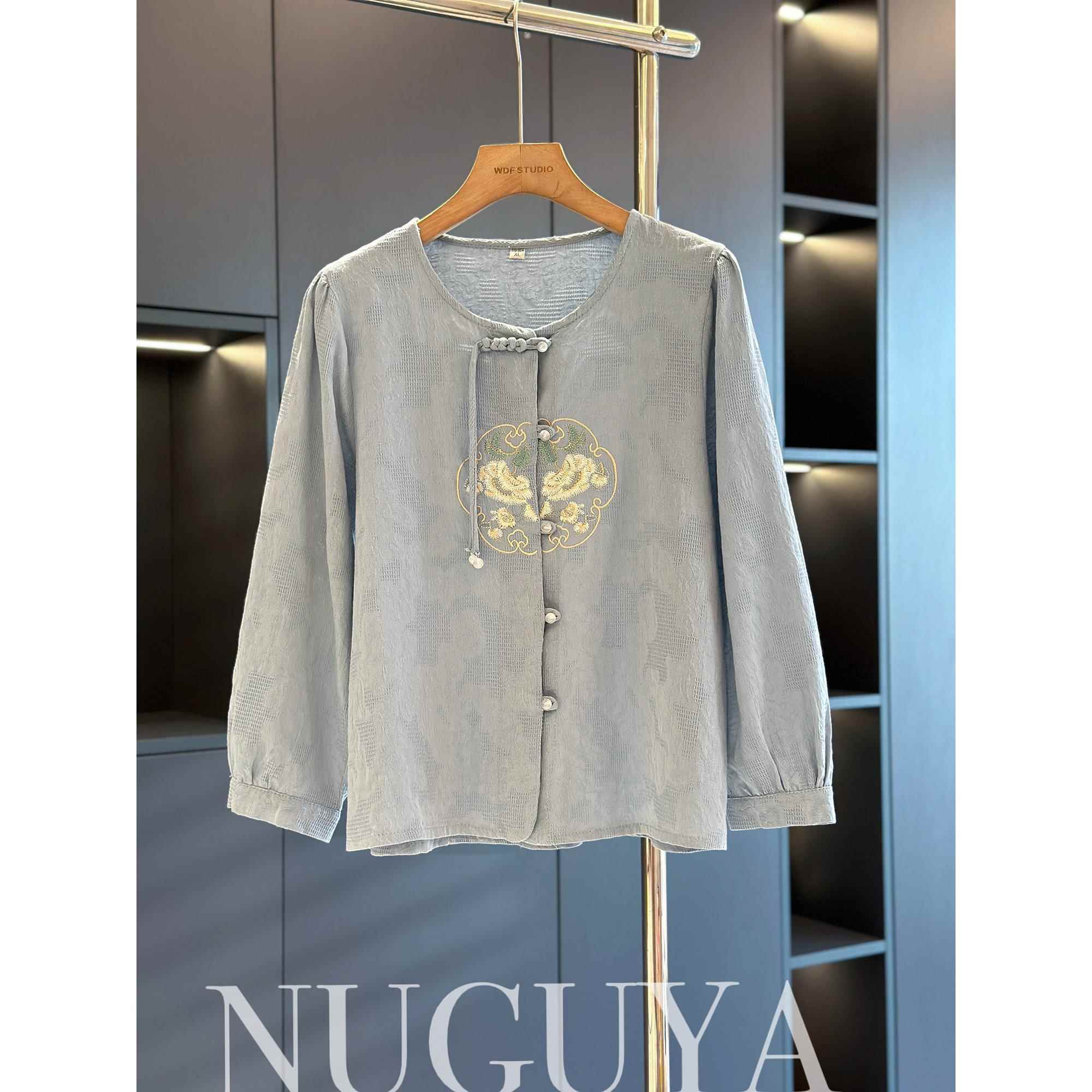 中老年国风棉麻T恤女开衫2025年春秋新款上衣妈妈装休闲气质衬衫