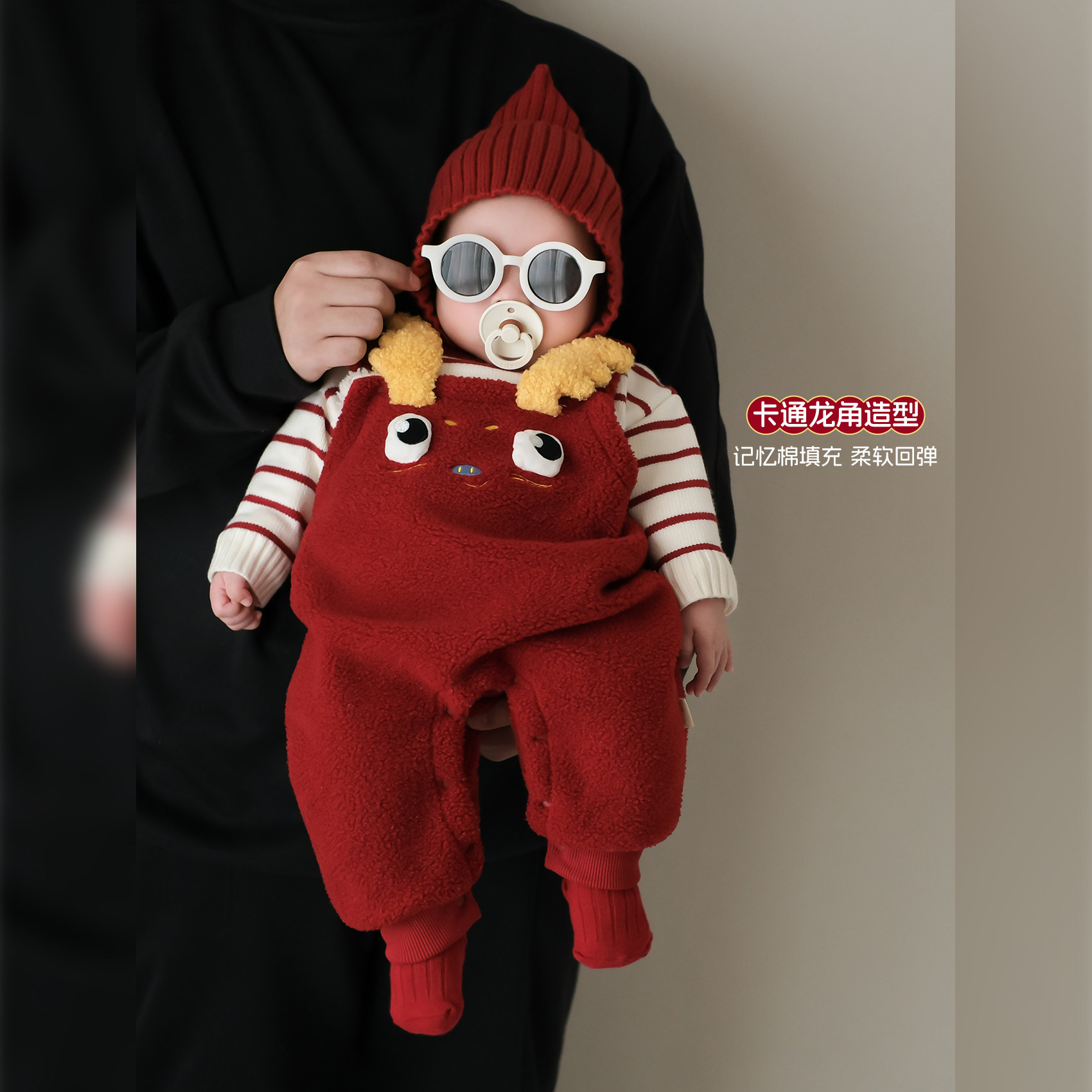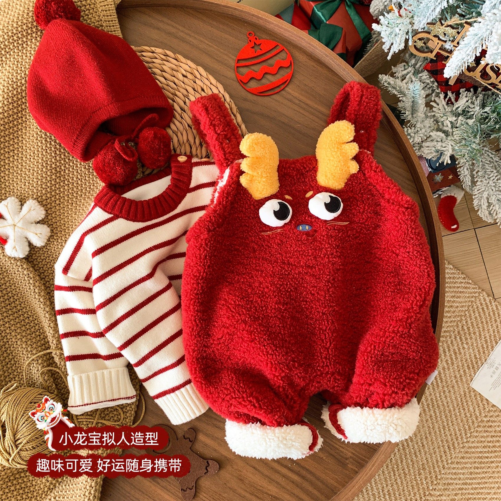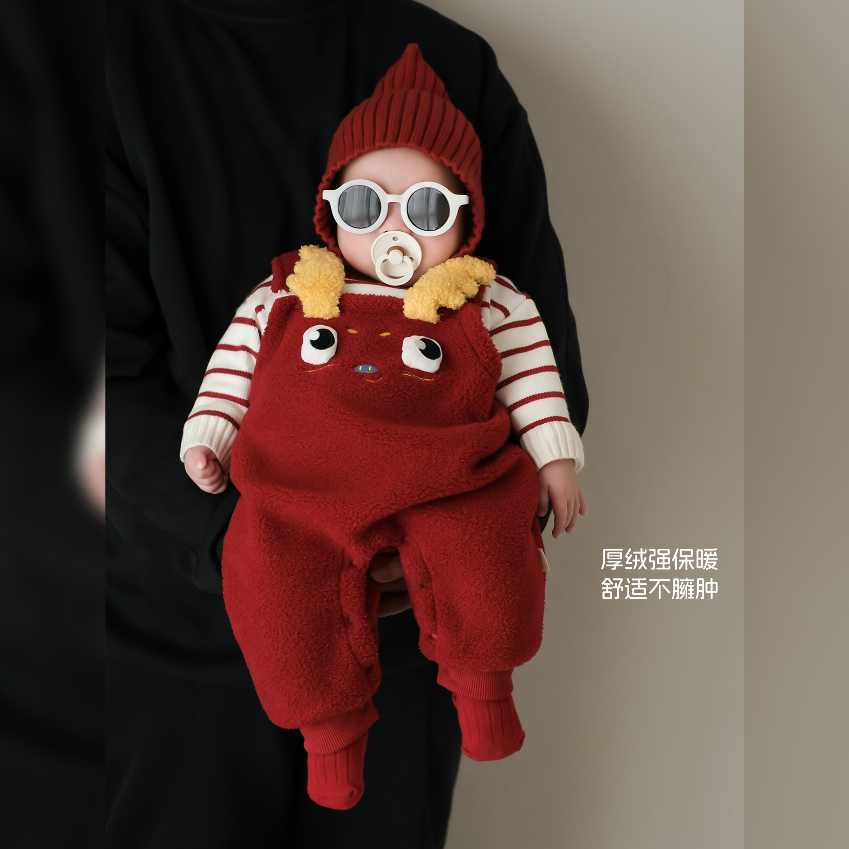 婴儿过年喜庆衣服冬季宝宝套装加厚保暖男童分体背带裤毛衣拜年服