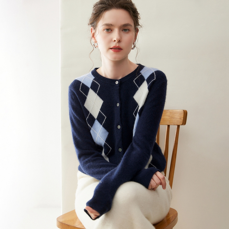 羊绒衫女纯羊绒圆领开衫菱形格针织毛衣宽松打底保暖休闲百搭简约