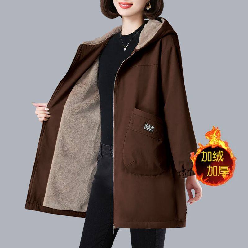 加绒大码宽松连帽短外套女春秋中老年妈妈装大口袋保暖中长款风衣