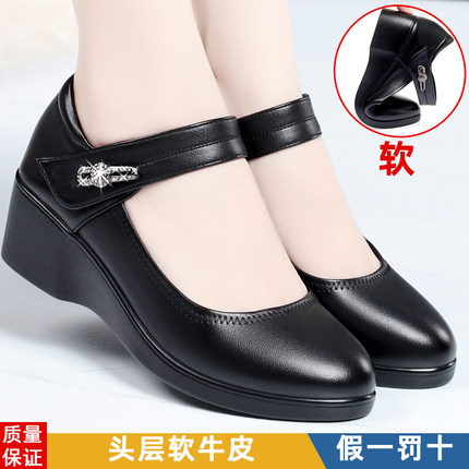 坡跟妈妈鞋单鞋真皮中跟女士皮鞋