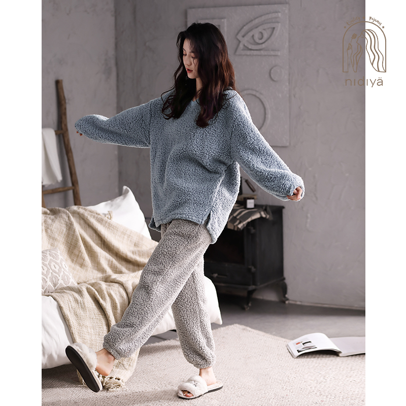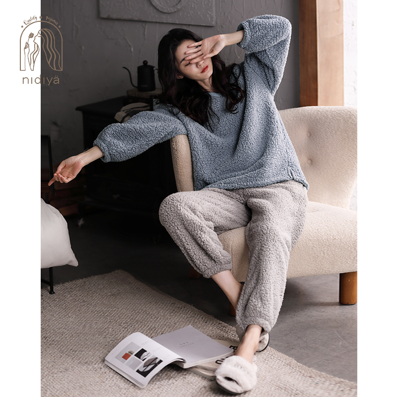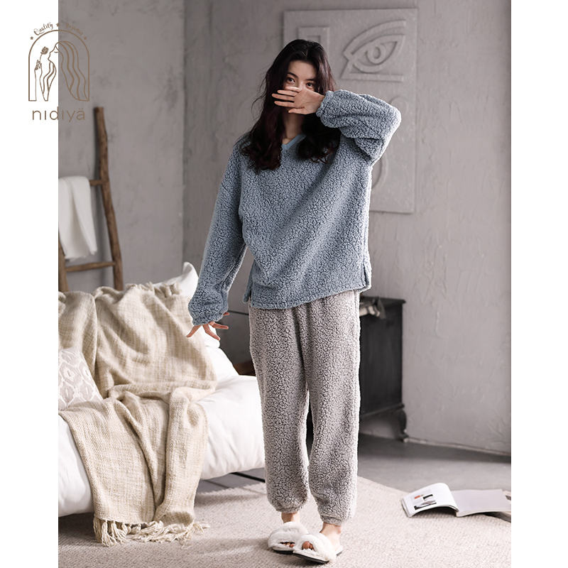 妮狄娅睡衣女冬保暖加厚珊瑚绒简约套头羊羔绒秋冬休闲家居服套装