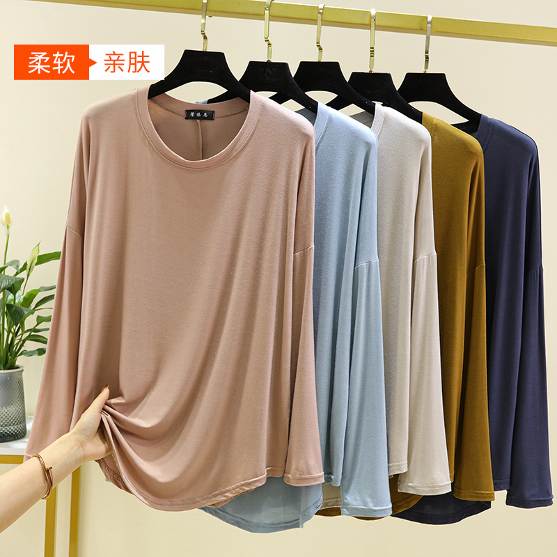 莫代尔长袖打底衫女春薄款休闲宽松上衣外穿大码纯色百搭防晒T恤
